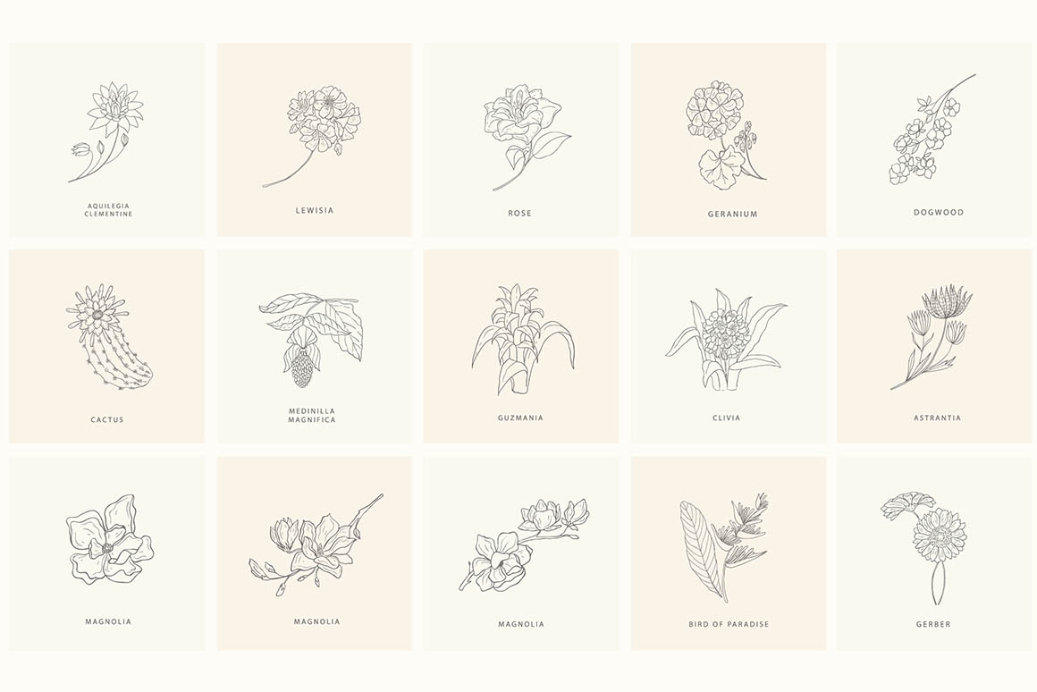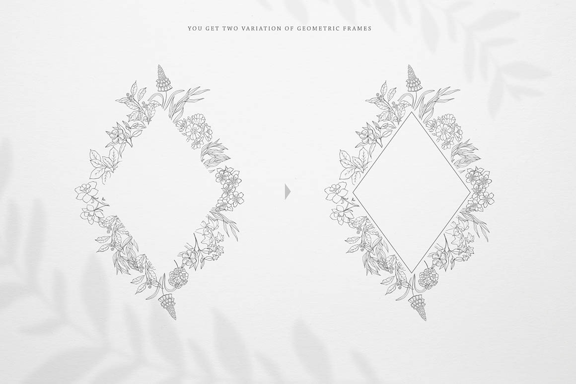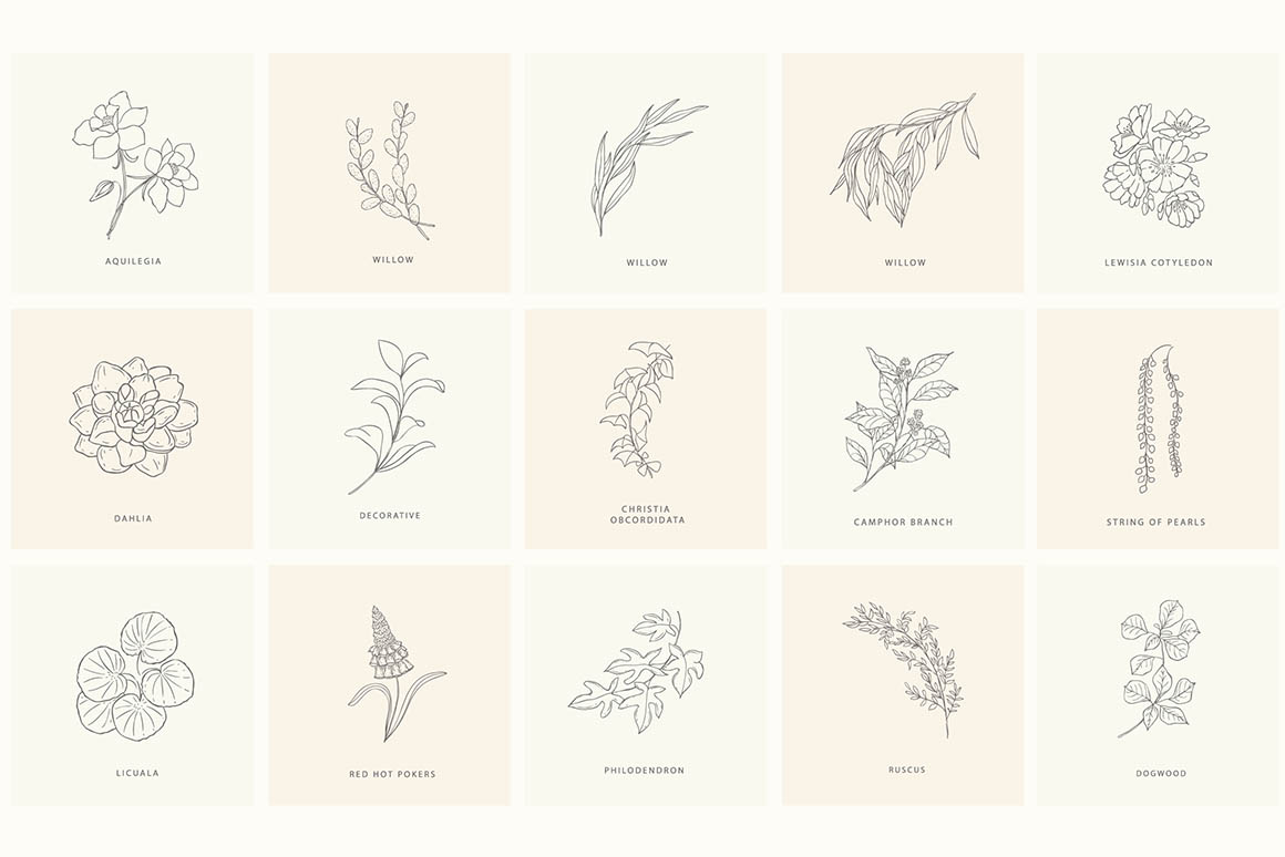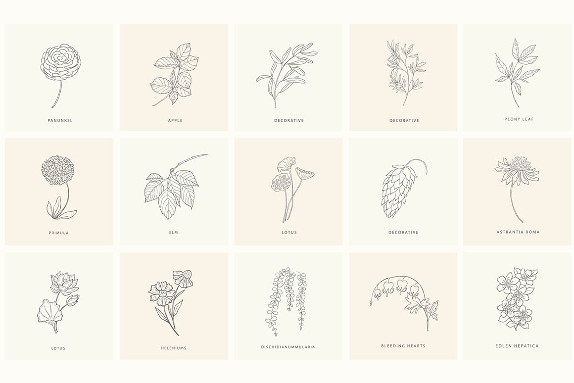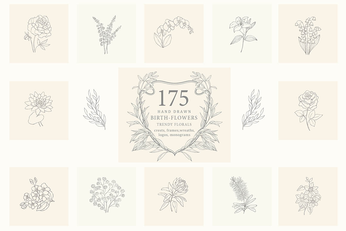 I’d like to introduce you my new Line Art collection: Birth-Flowers. Trendy Plants, Logos. My previous similar sets are very popular, so I’m glad to release another one 🙂 This big collection of 175 beautiful Hand Drawn Floral Design Elements and 38 Frames, Crests, Wreaths and Monograms. That are great for logo, jewellery, branding, print, decor, decoration, invitation, wedding design, greeting cards and more.