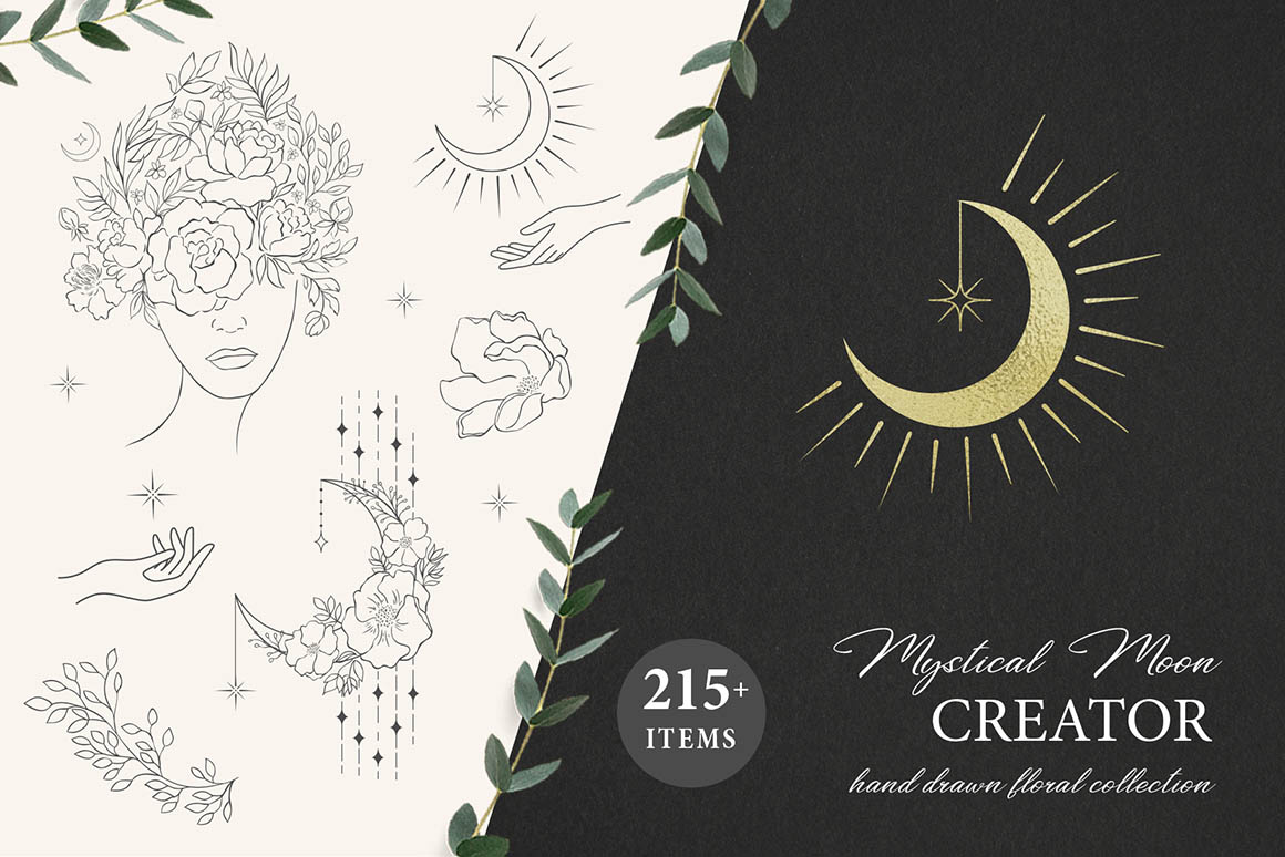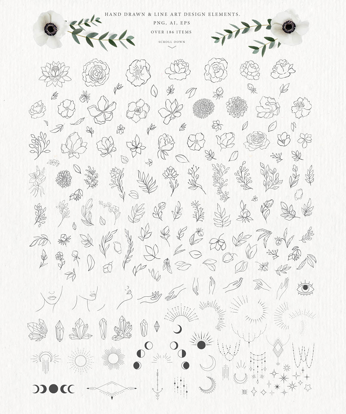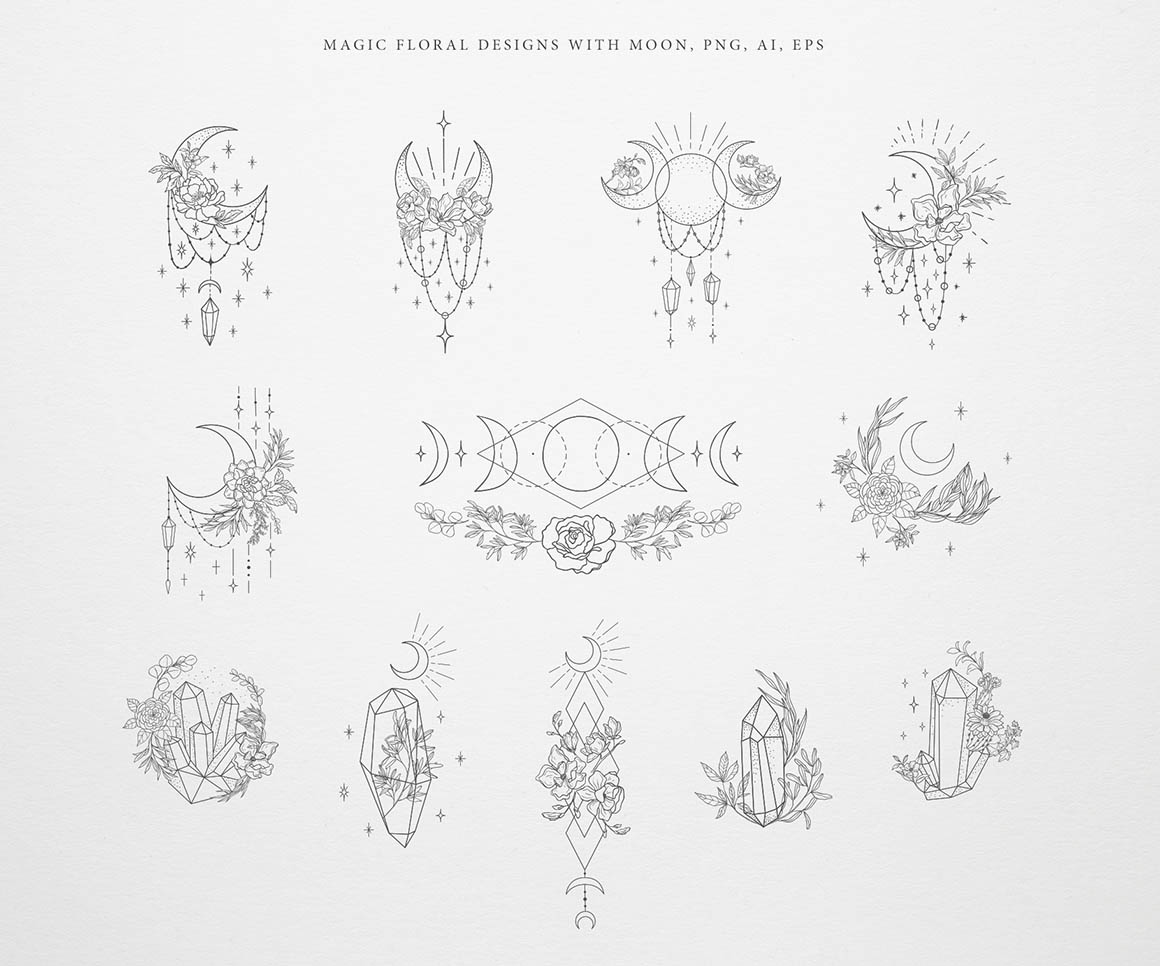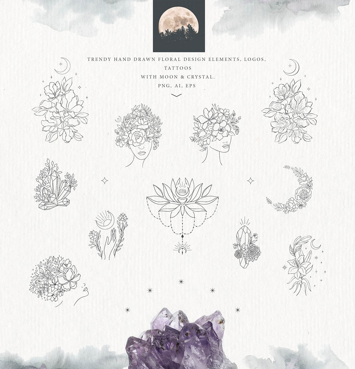 Here is a new trendy big collection in line art with over, than 215 unique Hand Drawn Floral Design Elements and ready designs with they and Moon & Crystals. All items are great for logo, branding, tattoo, decor, decoration, invitation, wedding design, packaging, t-shirt prints, stickers, greeting cards and more.