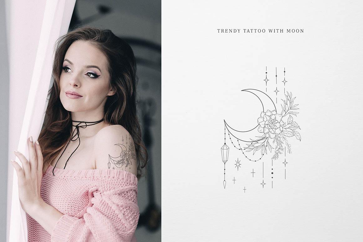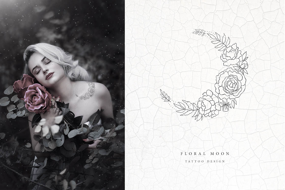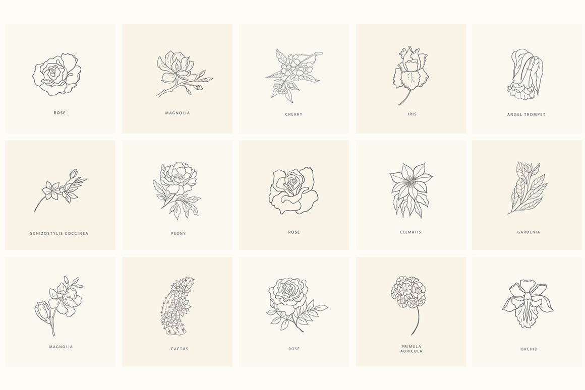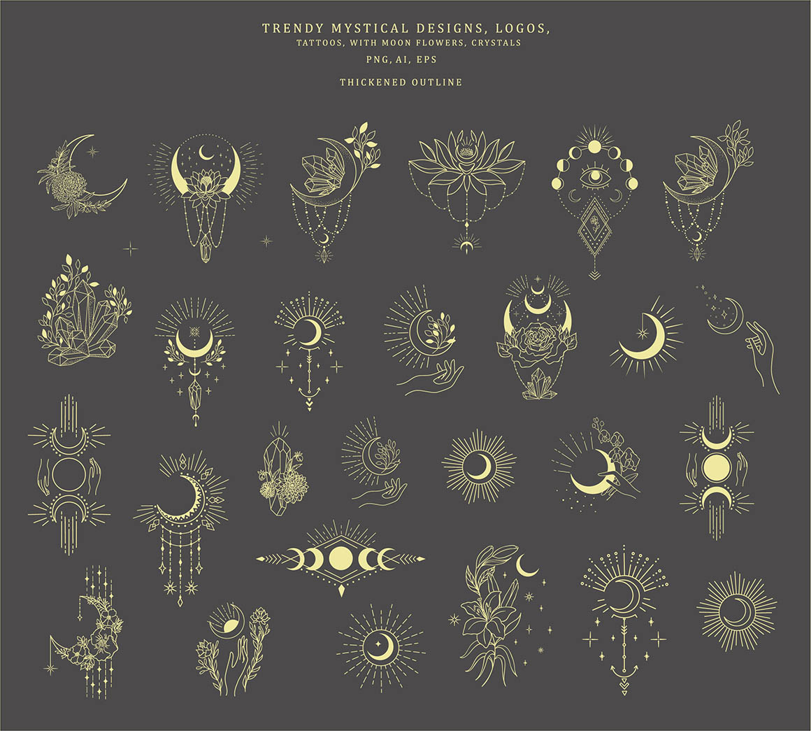 Here is a new trendy big collection in line art with over, than 215 unique Hand Drawn Floral Design Elements and ready designs with they and Moon & Crystals. All items are great for logo, branding, tattoo, decor, decoration, invitation, wedding design, packaging, t-shirt prints, stickers, greeting cards and more.