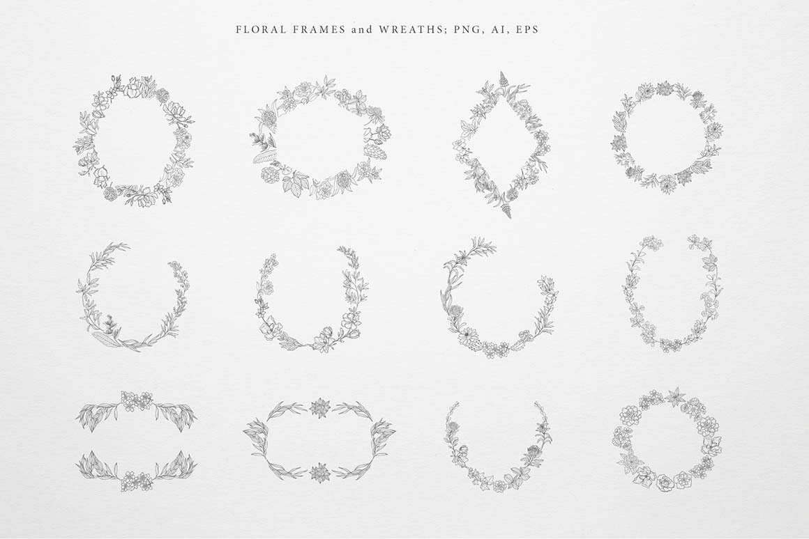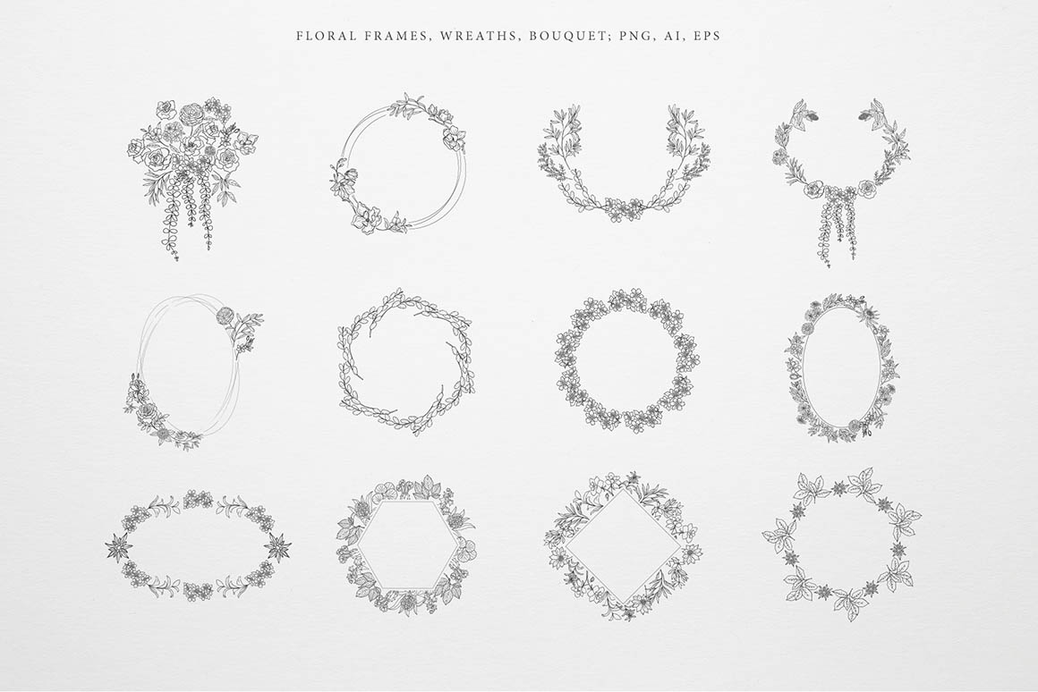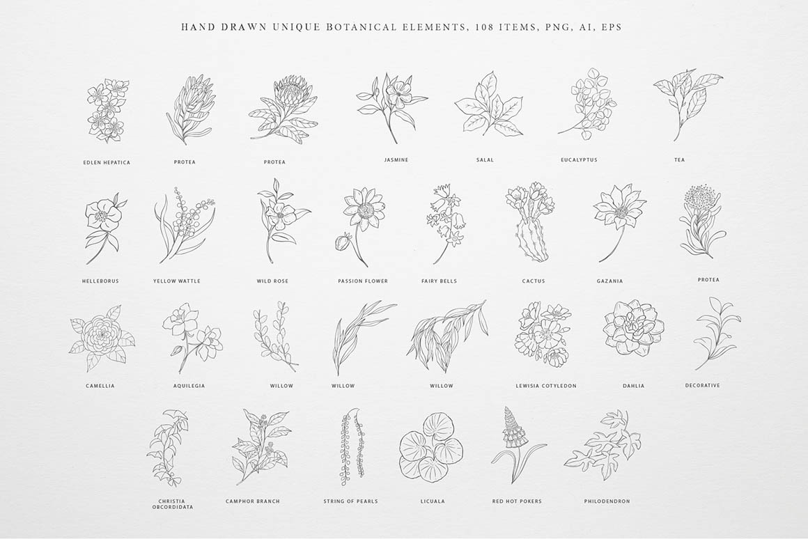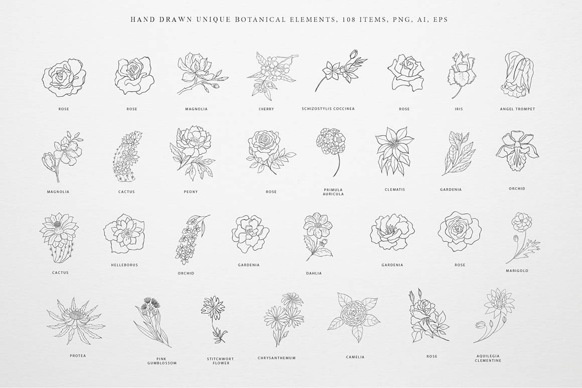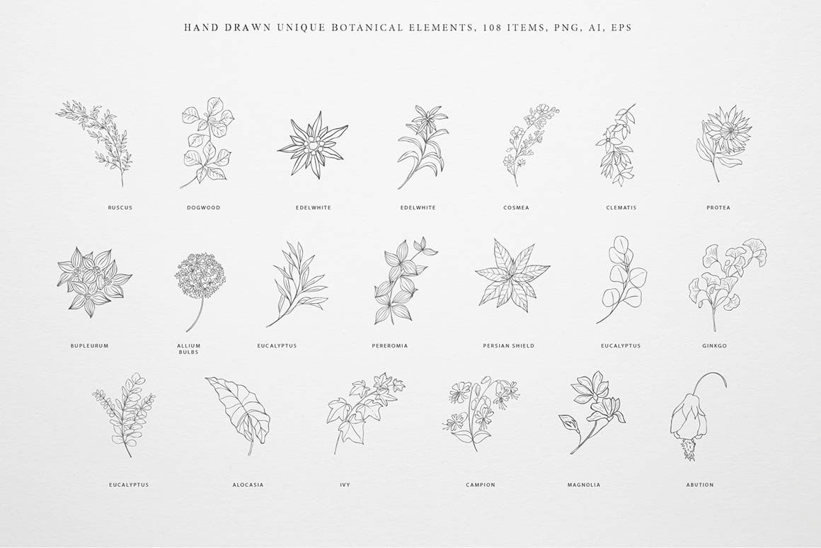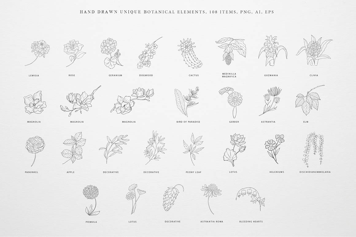 - 108 hand-drawn floral elements, as AI, EPS, separated PNG (5000×5000 px, 300dpi) files