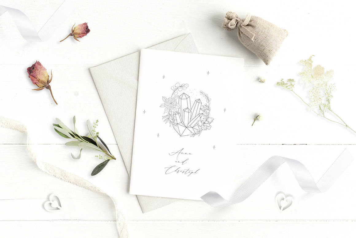 - 4 designs with flowers and crystals, (each black/white, gold), as AI, EPS, separated PNG (5000×5000 px, 300 dpi)