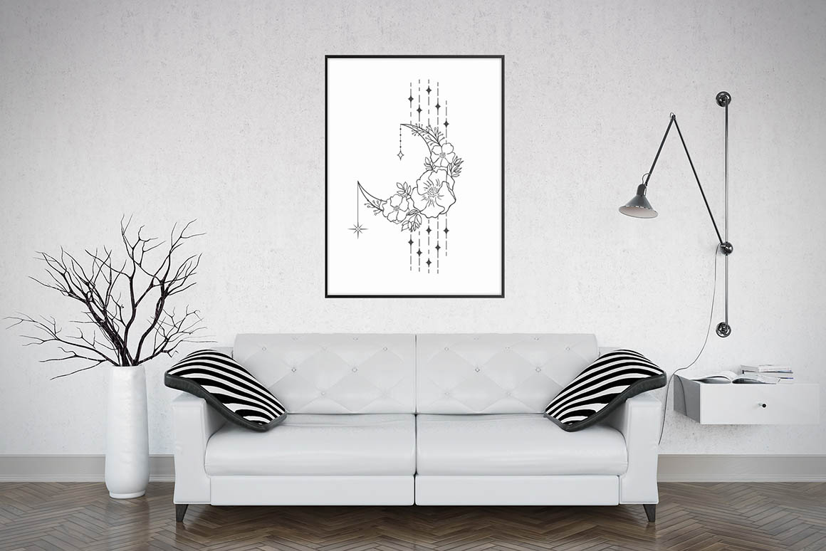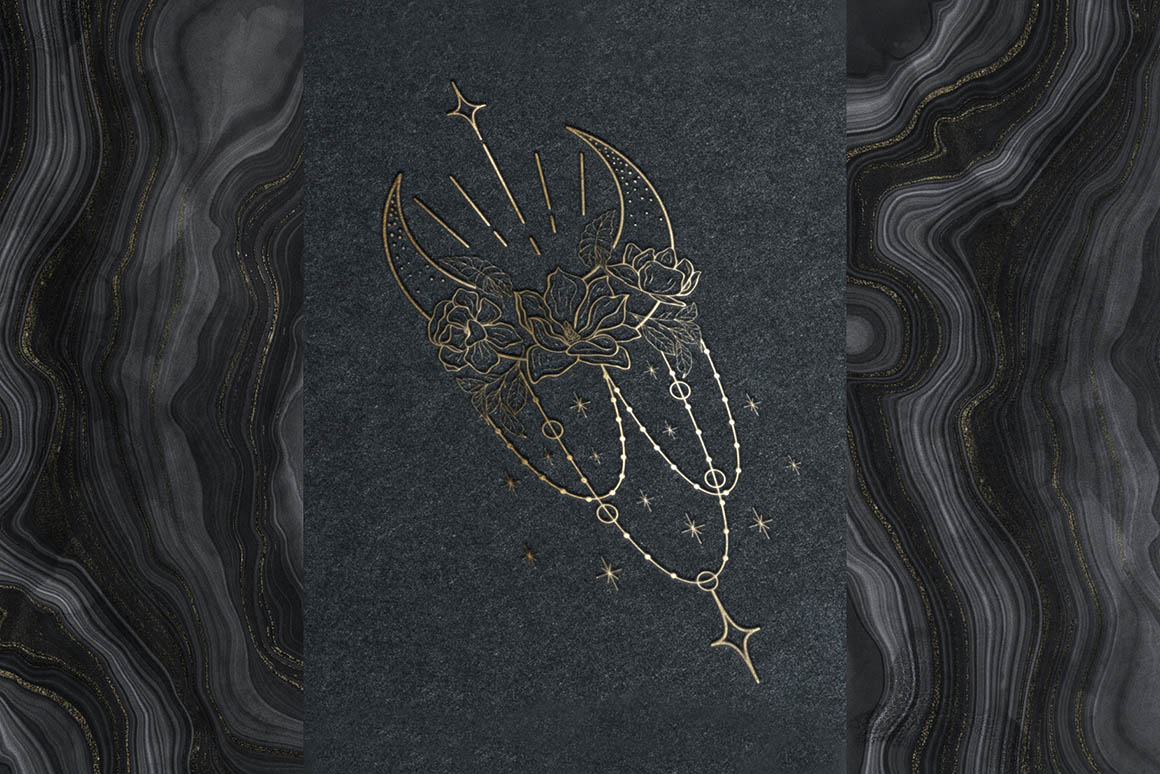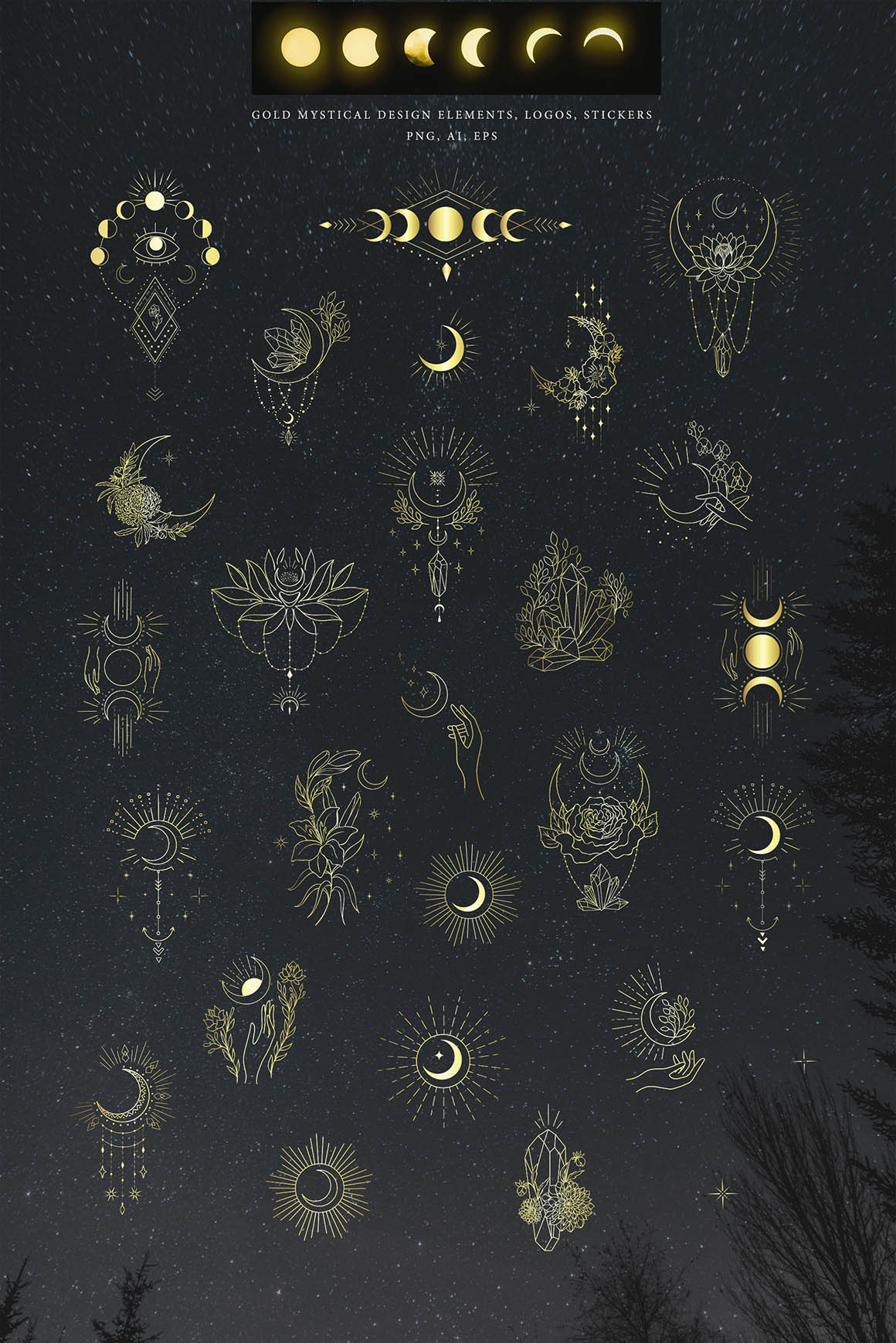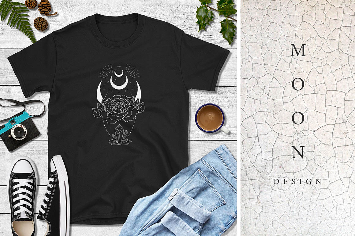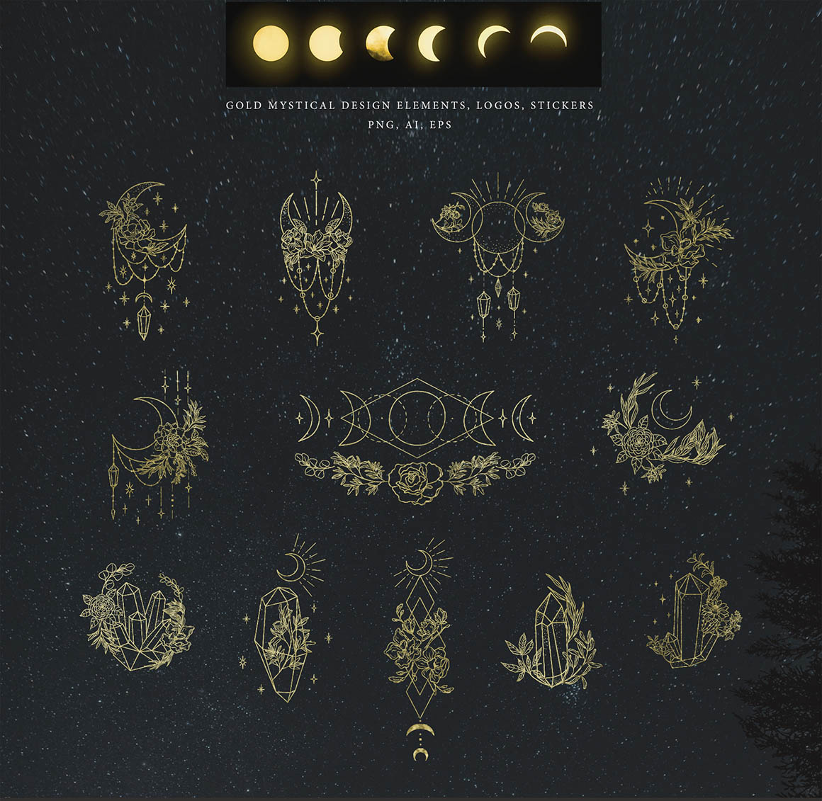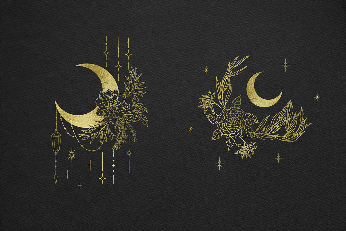 - 8 designs with moon and flowers, as AI, (each black/white, gold), as Ai, EPS, separated PNG (5000×5000 px, 300 dpi)