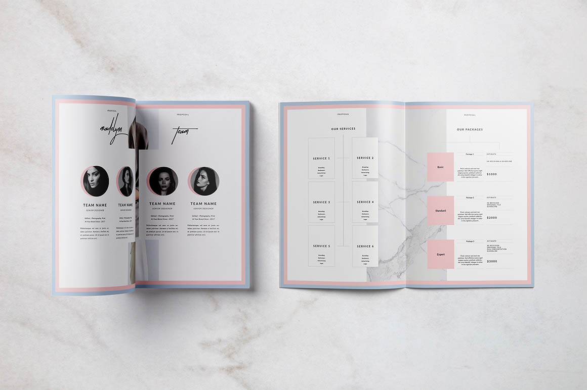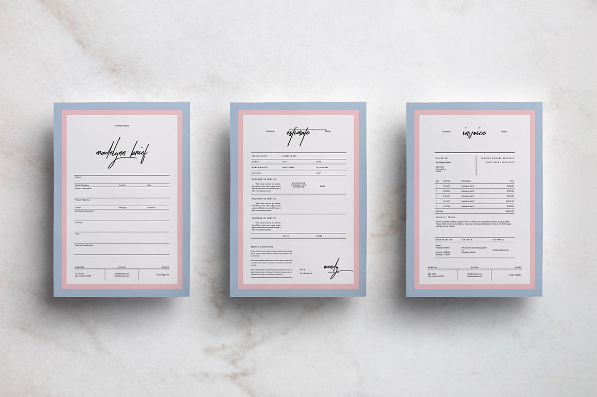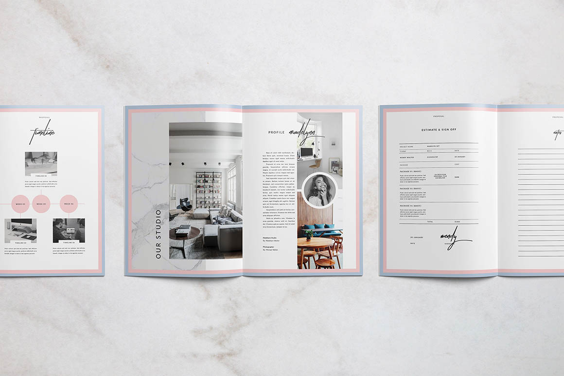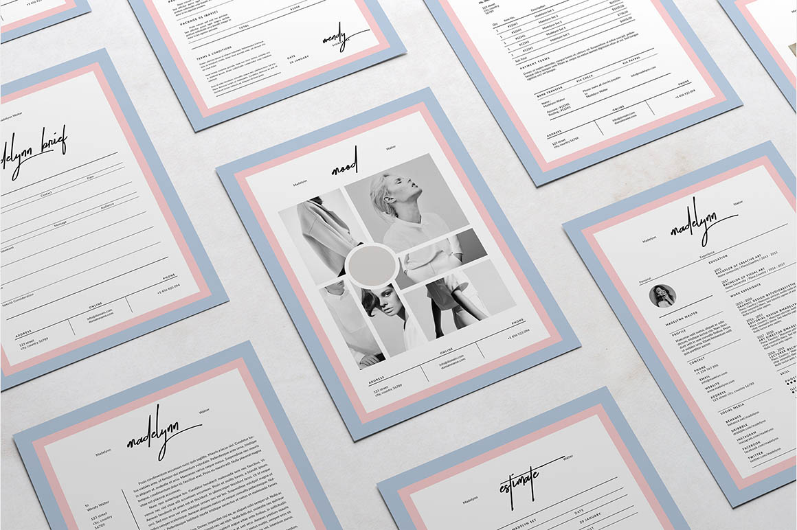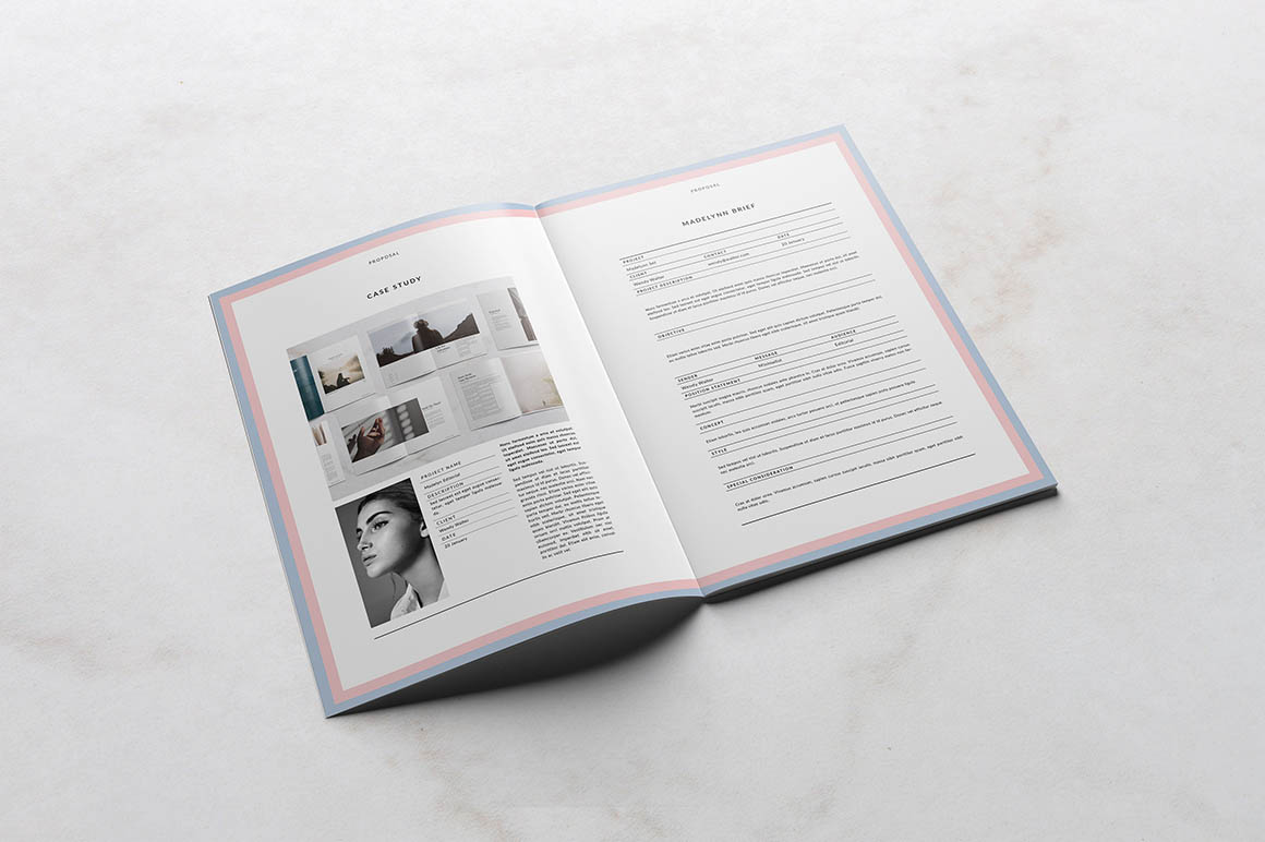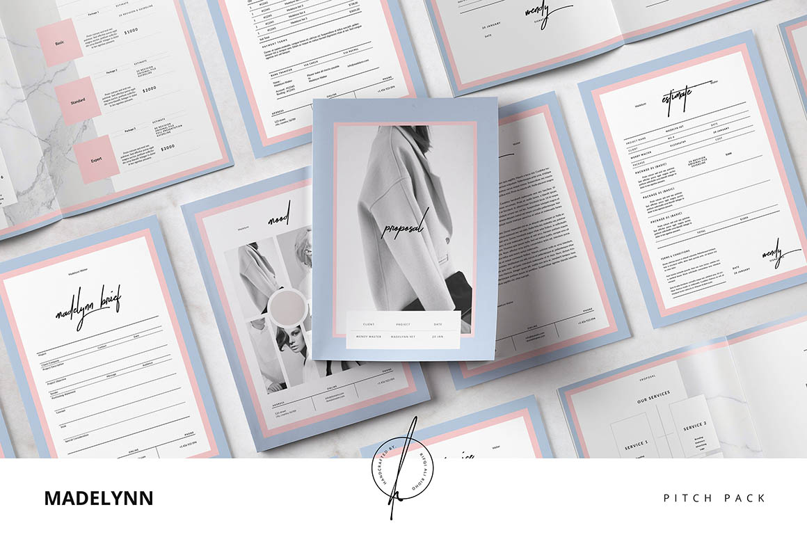Madelynn Pitch Pack includes proposal and other templates made with Adobe Indesign to simplify your business with clients. This pitch pack collection has 8 templates with the same clean and minimal layout theme. A design of 20 page proposal template and 7 other trinkets comes in two sizes, standard size A4 and US letter size for variations and ready to print.