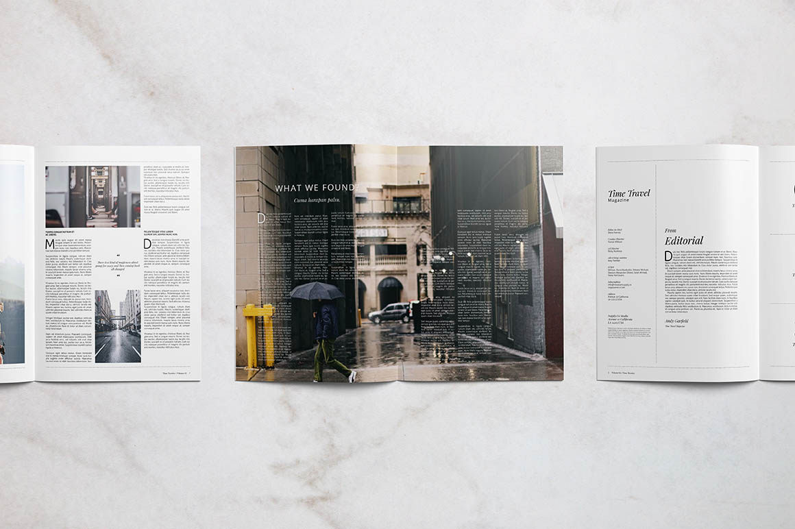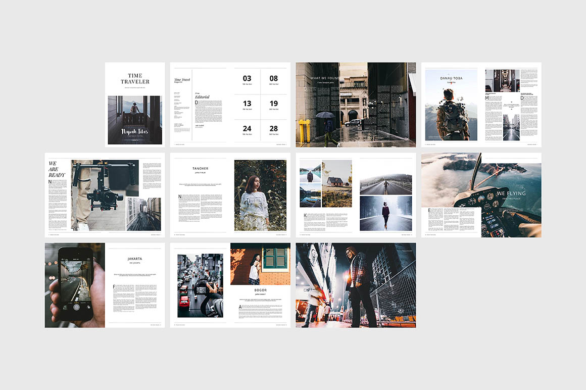 The Time Travelers Magazine is traveling and portfolio magazine with 30 pages. This is for publication magazine, portfolio, photography, and more. With both size A4 & US Letter size. There are unique spread for your publication and easy to change with your own color pallete, work with master page to make automatic numbering, easy to change all text with paragraph style.