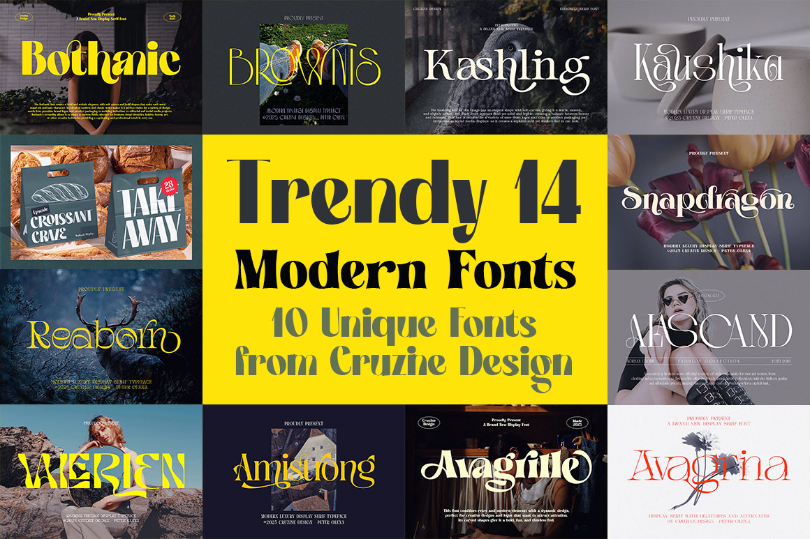 Trendy & Modern Fonts 14 from Cruzine Design contains 10 fancy, stylish, elegant, fancy, classy & decorative display fonts for your new projects! Don’t miss this creative & fashion style font & branding bundle 😉