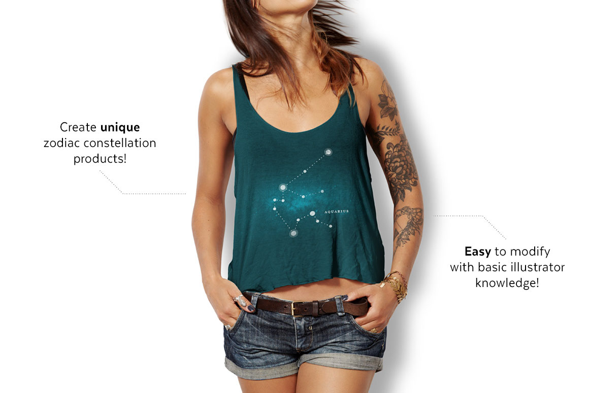 Constellations Vector Set comes with 44 unique handcrafted star groups and sky wheel graphic. They can be screened back as a background element or used as a prominent foreground design element. Perfect for products (such as t-shirts, pillows, etc), album covers, websites, flyers, posters or any design project you can dream up! All illustrations are vector-based and easy to modify with basic Illustrator knowledge. BONUS – Beautiful handcrafted star-filled sky background (Hi-Res 4500 x 5609) & poster design.