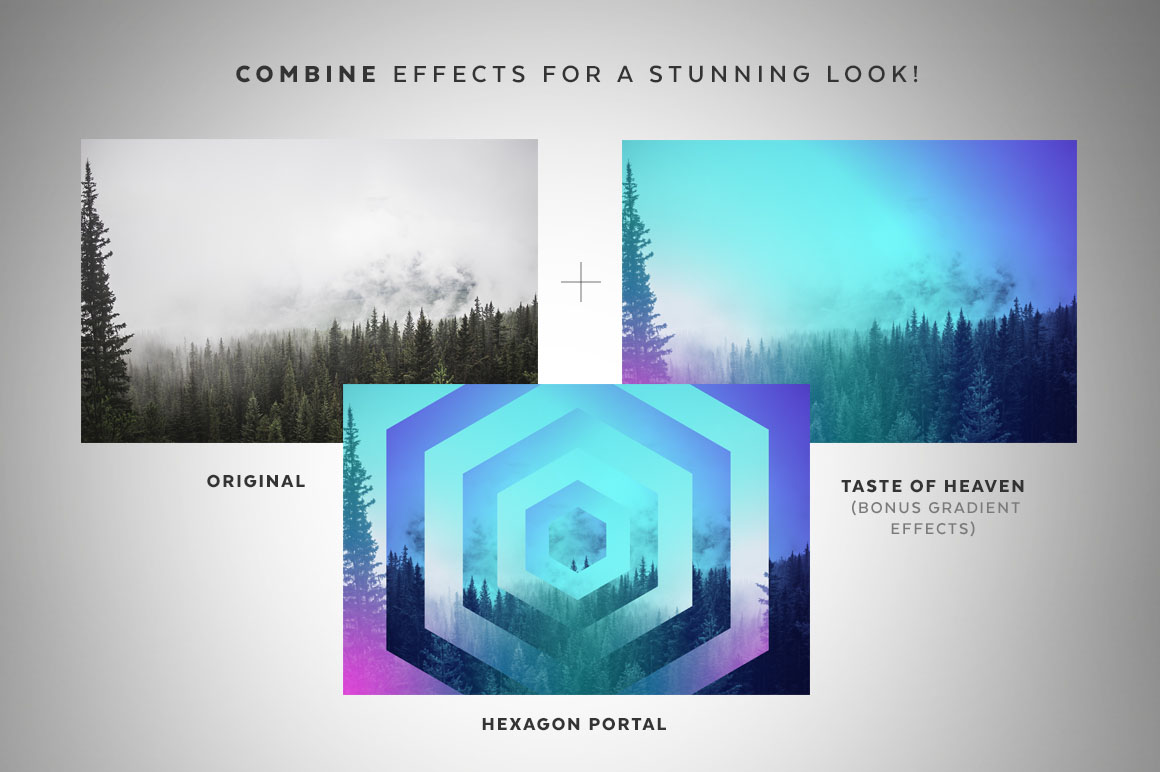 Create stunning, interdimensional effects with this brand new set of Photoshop Actions! With just a single click, you can add depth, contrast and a powerful unique look to your design projects. Perfect for album covers, website backgrounds, social media (hello instagram!), journals, cell phone cases… the possibilities are endless. And with the BONUS Gradient Overlay Effects, you can create a powerful image unlike anything else out there! Watch the tutorial for ideas of how to combine and layer effects… Play around and see what kind of designs you can create!