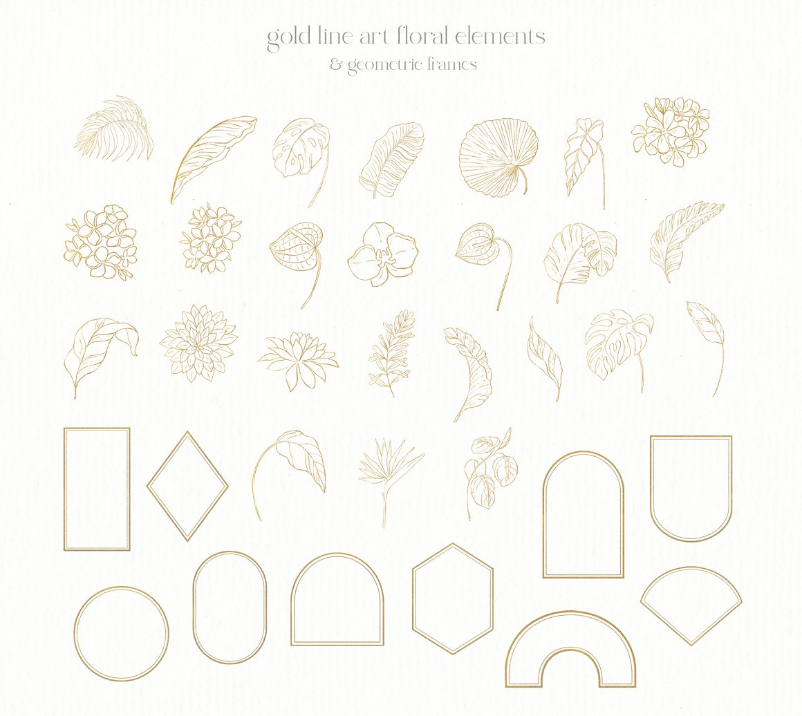 - 25 Floral gold line art elements, ~1700 x 3000 px, PNG 300 dpi