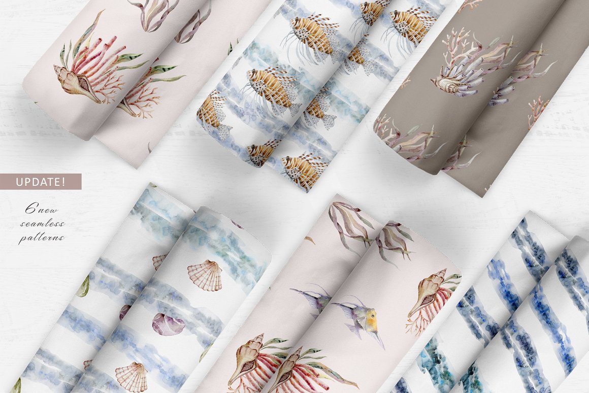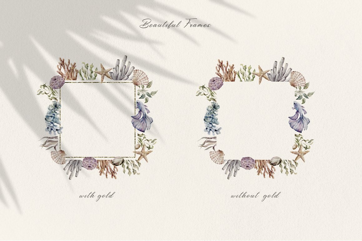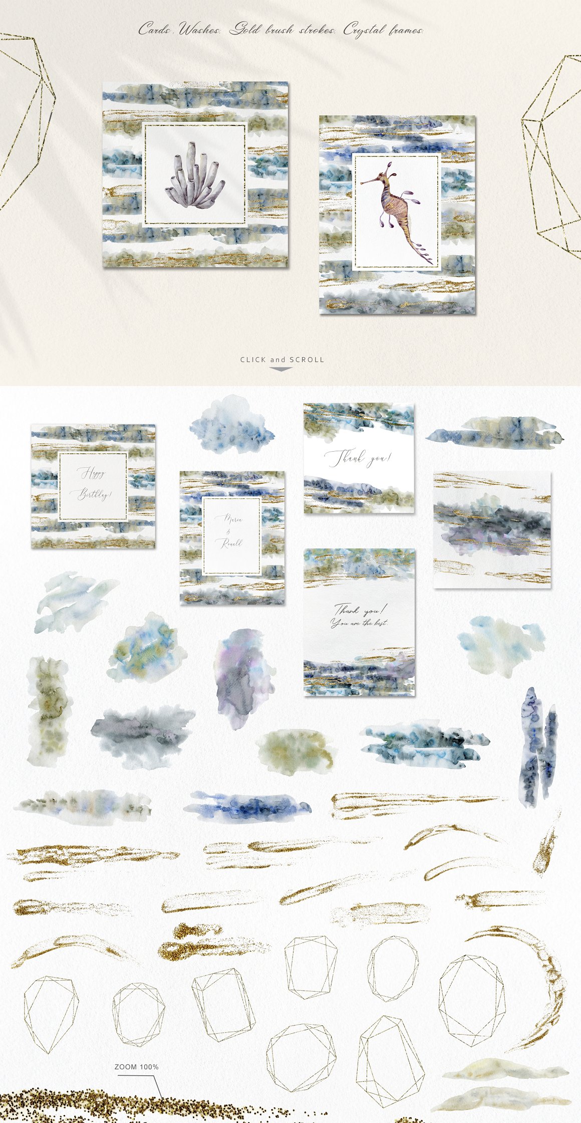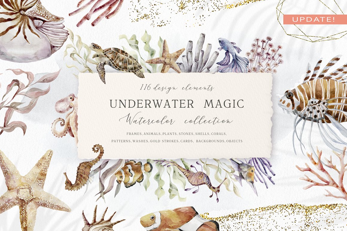 “Underwater Magic” is a beautiful watercolor collection with a lot of sea animals, seaweeds, corals, design elements, frames, seamless patterns, backgrounds, cards, gold brush strokes, objects.