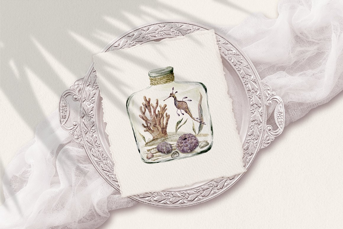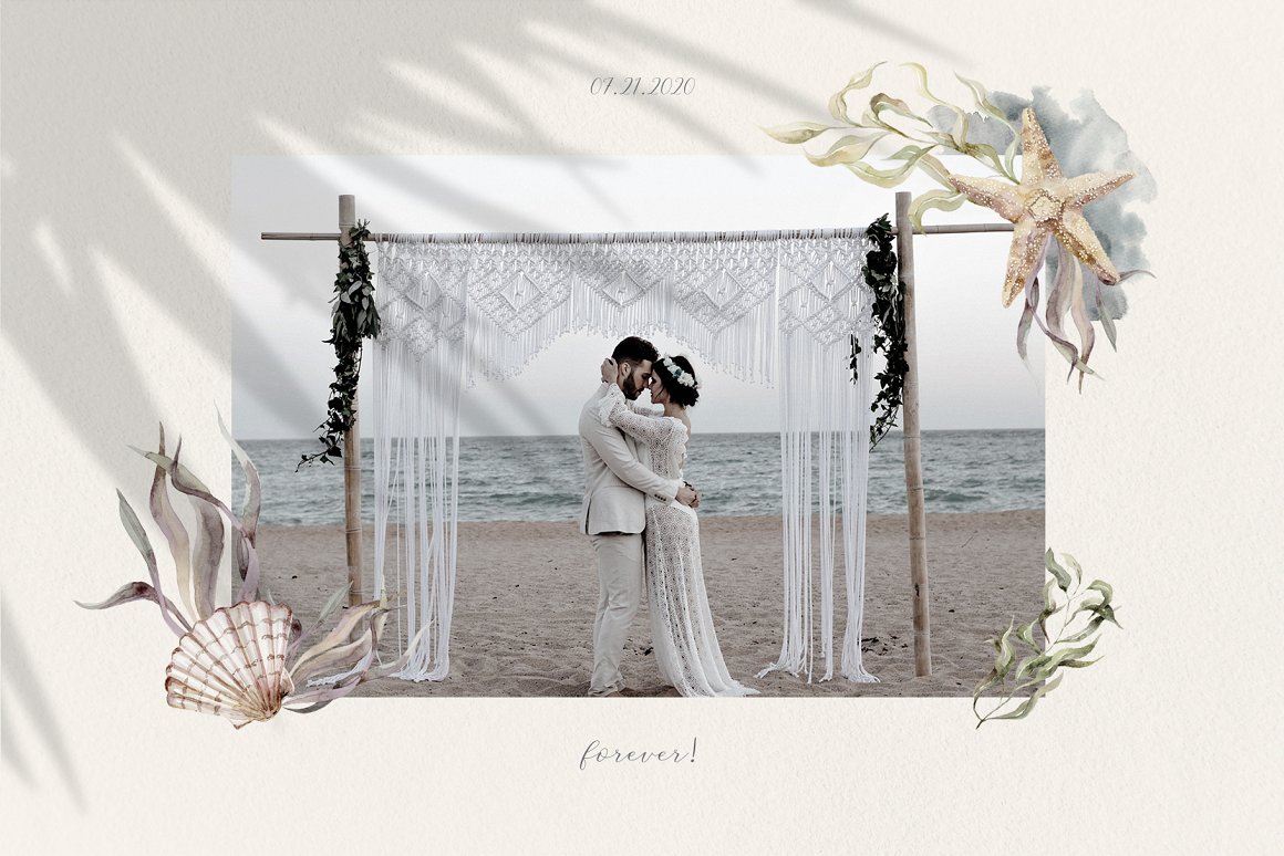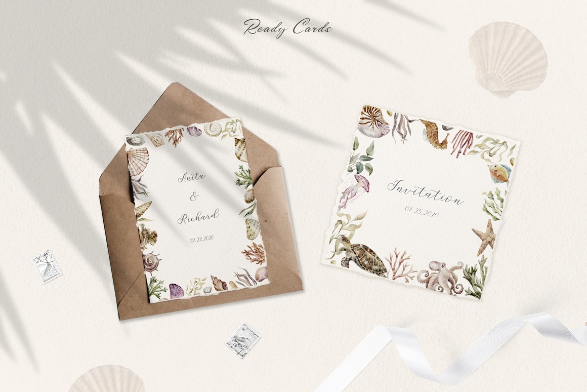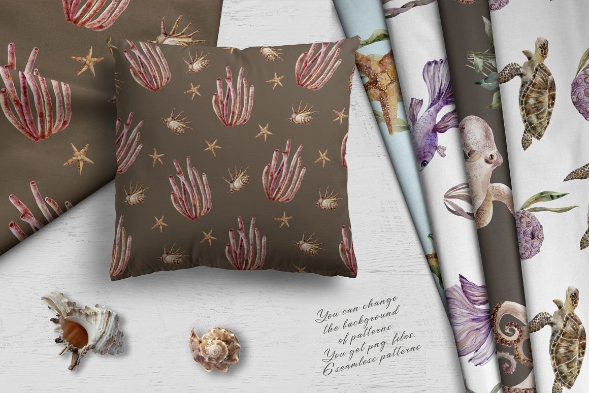 “Underwater Magic” is a beautiful watercolor collection with a lot of sea animals, seaweeds, corals, design elements, frames, seamless patterns, backgrounds, cards, gold brush strokes, objects.