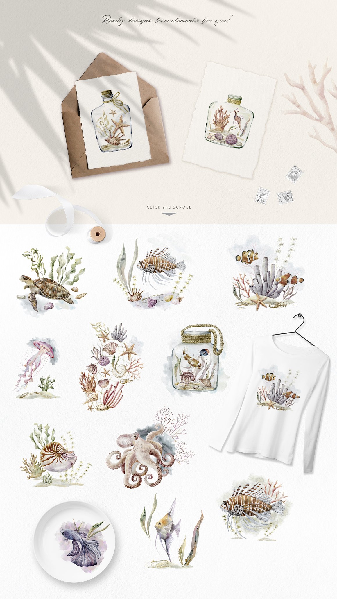 Need some cute, tropical, underwater & watercolor style illustration or graphic set for your new web or print project? Whatever the case, this amazing illustration or artistic graphics bundle with lot of hand drawn illustrations, graphic elements, compositions & patterns is great source for all print or branding designers. You’ll find 2 big watercolor illustration sets in this bundle! These graphics are in hi-res PNG or JPG image format so all are great for your new web design or any print design projects. Enjoy 😉