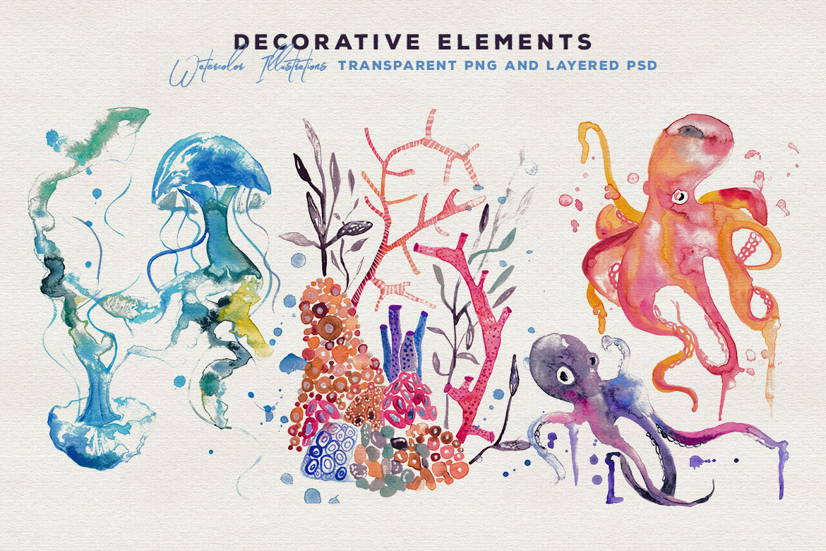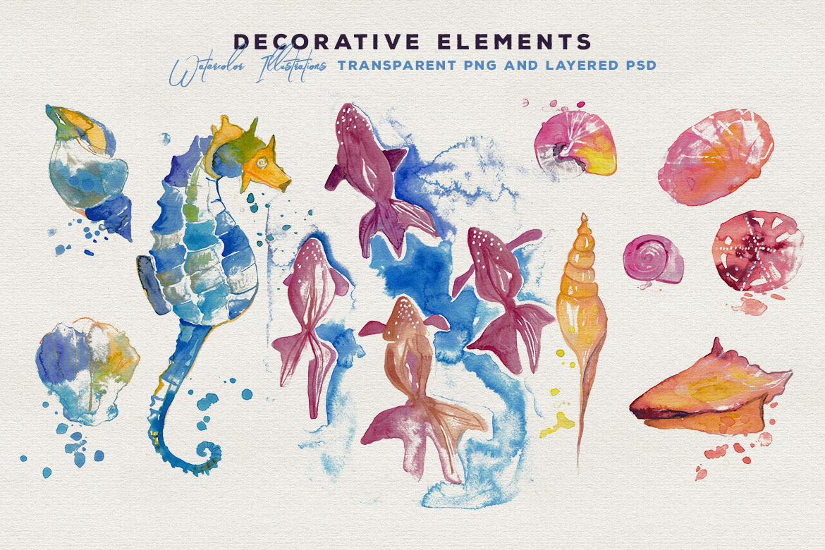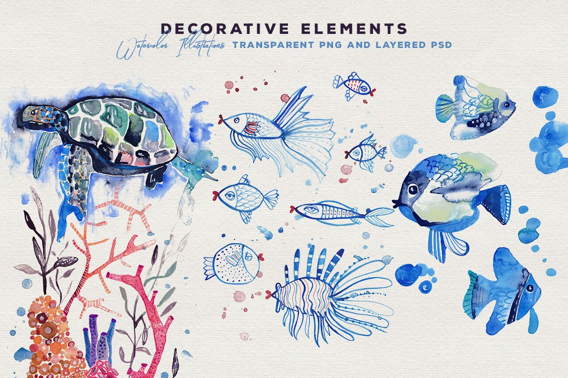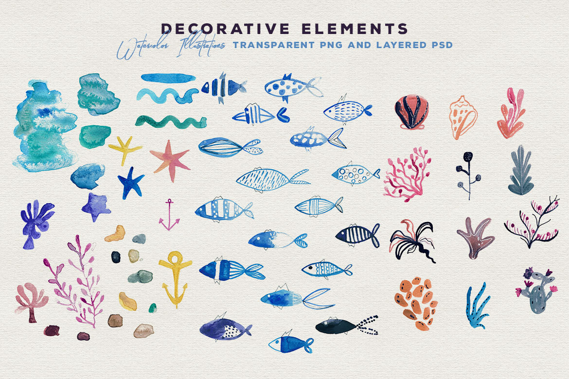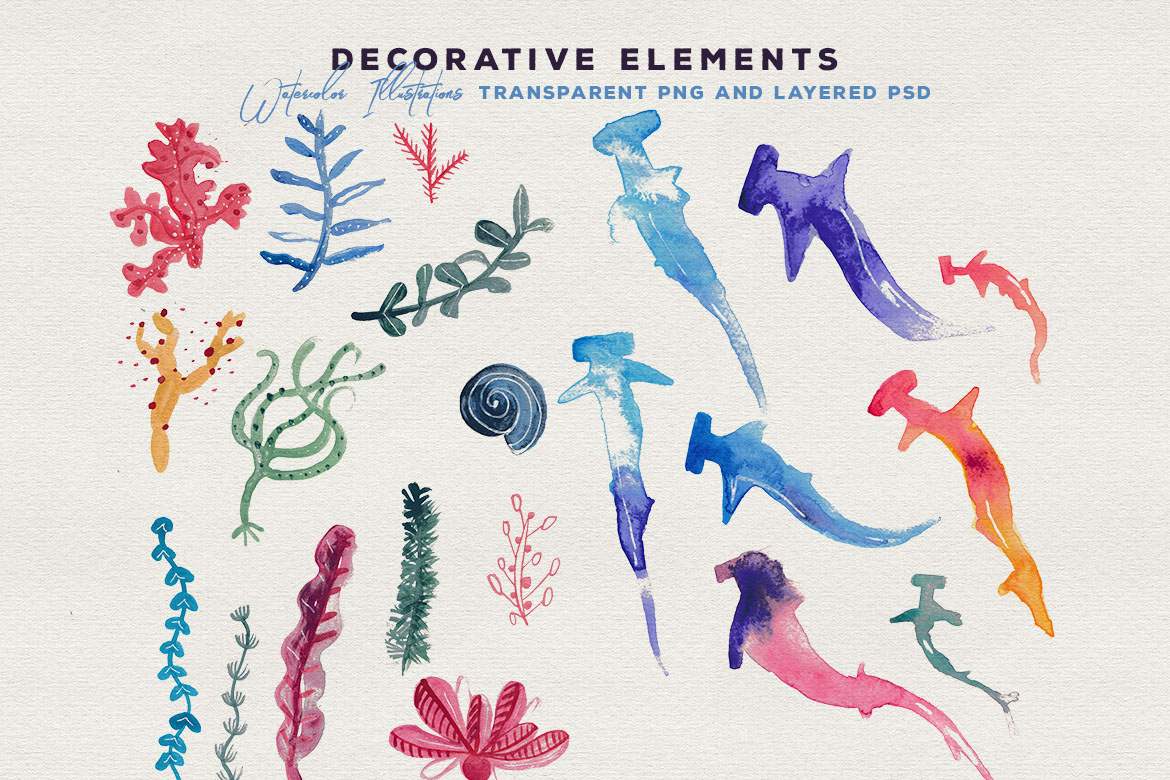 If you are looking for some unique & modern watercolor illustrations or graphic ellements then you are at the right place because here you will get a great collection of underwater world illustrations for your new artistic projects. You’ll find here a lot of illustration elements, patterns, textures & backgrounds… These graphics are in vector hi-res PNG or JPG formats so all are great for your new web design or any print design projects. Enjoy 😉