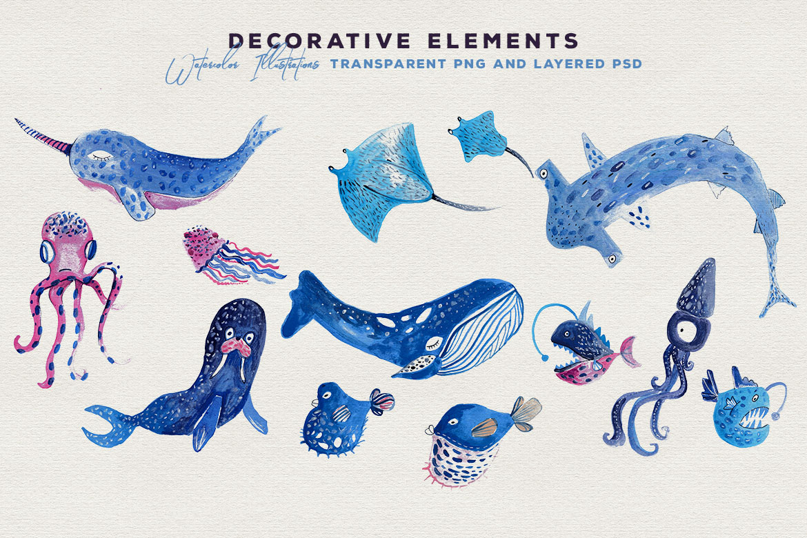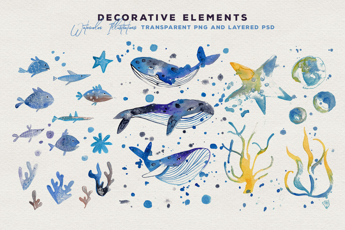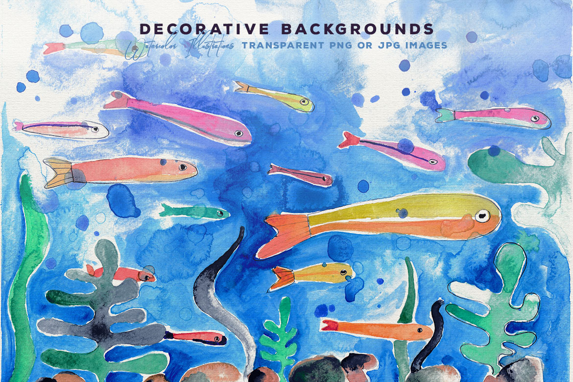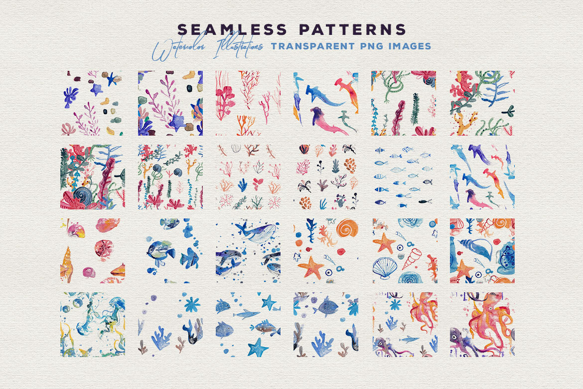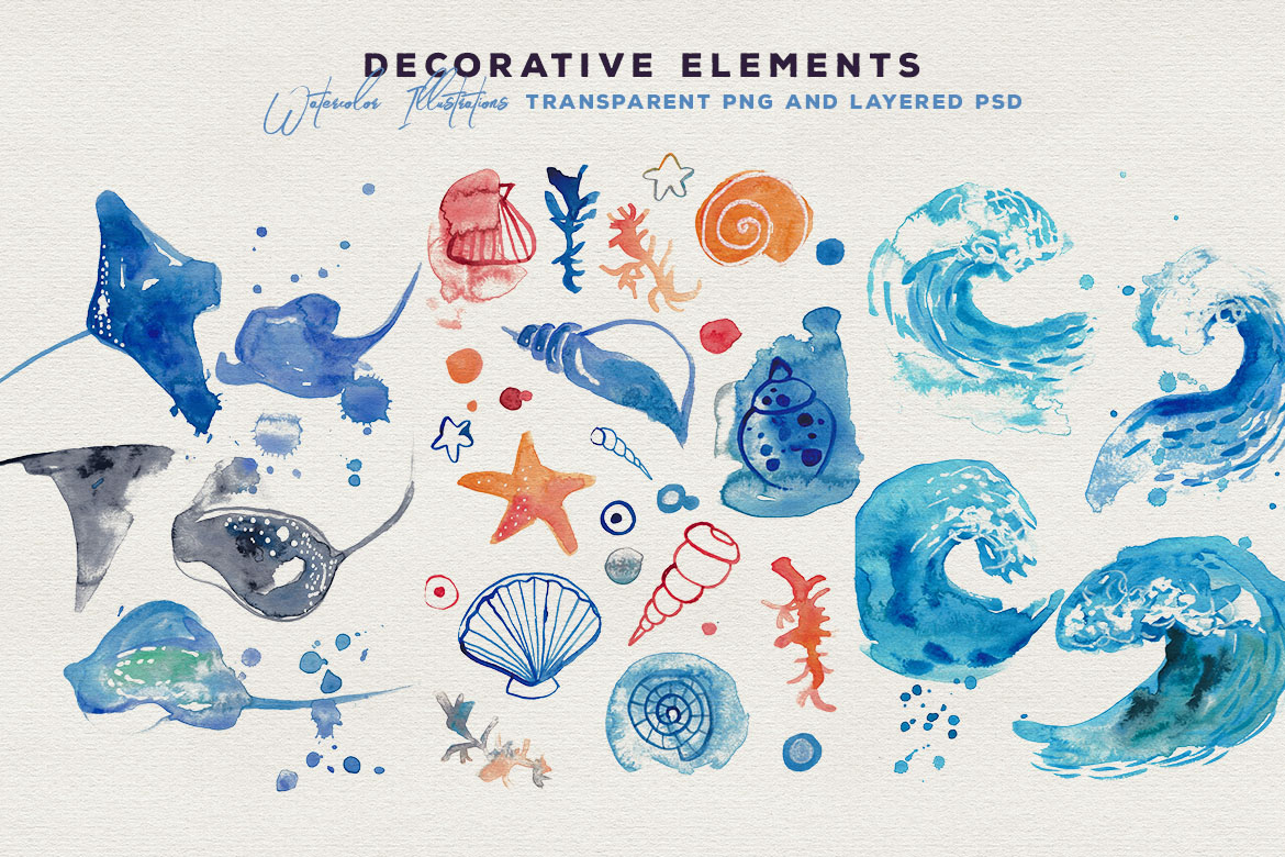 If you are looking for some unique & modern watercolor illustrations or graphic ellements then you are at the right place because here you will get a great collection of underwater world illustrations for your new artistic projects. You’ll find here a lot of illustration elements, patterns, textures & backgrounds… These graphics are in vector hi-res PNG or JPG formats so all are great for your new web design or any print design projects. Enjoy 😉