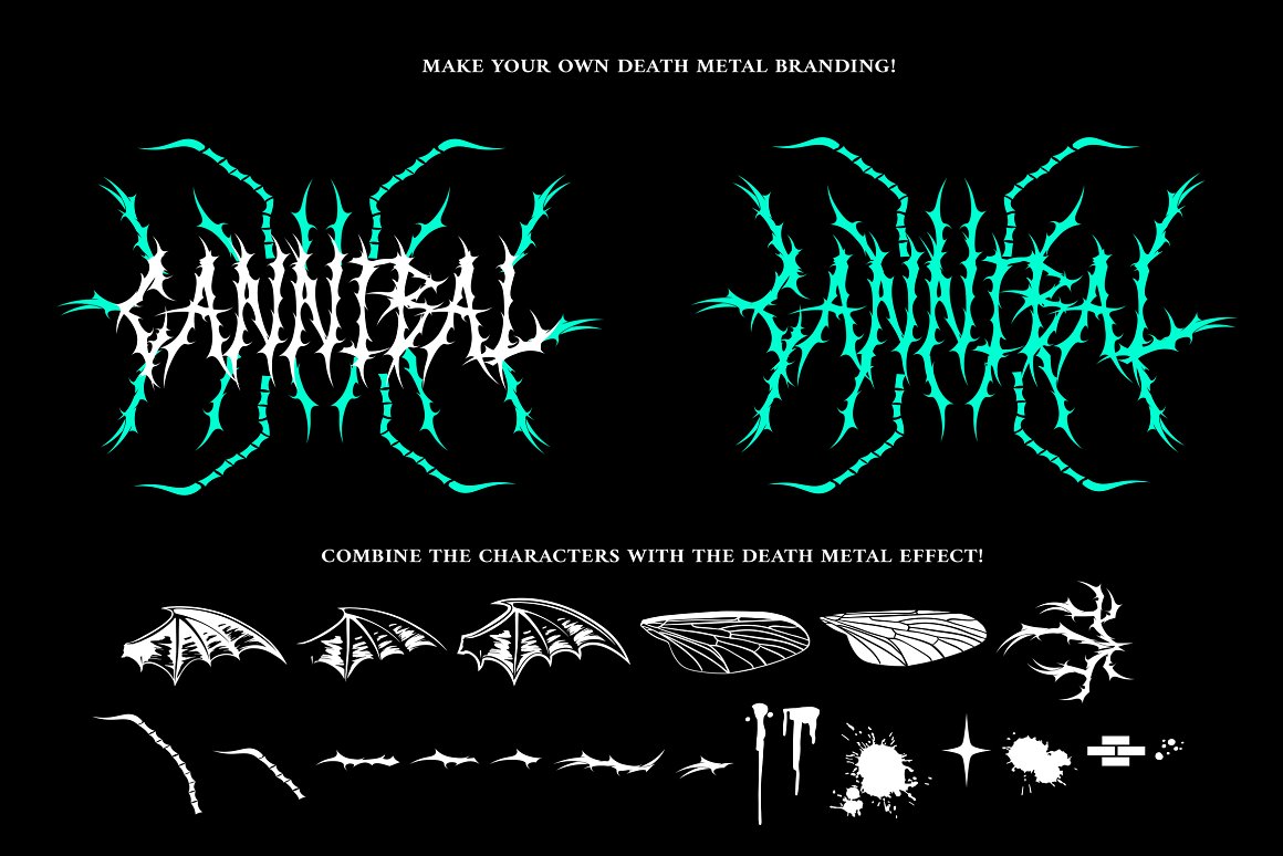 This savage death metal font is can be used for logos or branding and your metal band name without having to pay for expensive logo-making services. Buying this font, you can immediately make your band or brand logo name. Combine it with the death metal ornaments and make your death metal design with ease! This black metal typeface is perfect for logotypes, t-shirts, vintage badges, branding, packaging, posters, clothing brands, horror movies, album covers, and many more!