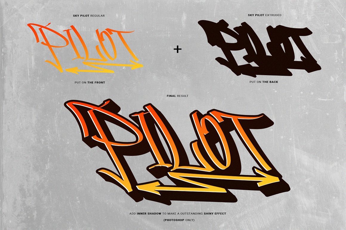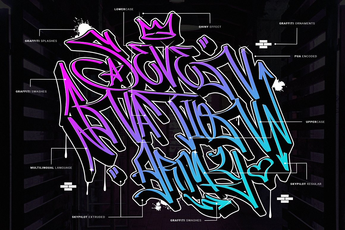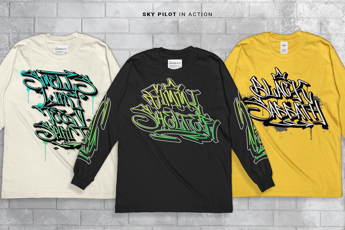 This font is carefully selected from hundreds of letters. We manually created this font using a flat pen and make it as close as possible to street graffiti style. Not only that, we also make another typeface that is perfectly suited for this theme, Skypilot extruded! With those fonts, you can combine them as a pair to make them a layered style! You will make exquisite real street graffiti art just like on the wall that you saw in the city! Besides all this, the Skypilot Swashes and ornaments are designed to customize your designs to be more fun as hell. You can apply this font to t-shirt designs, posters, covers, video thumbnails, merchandise, wall, and so on to make it look special.