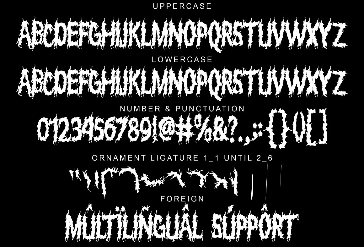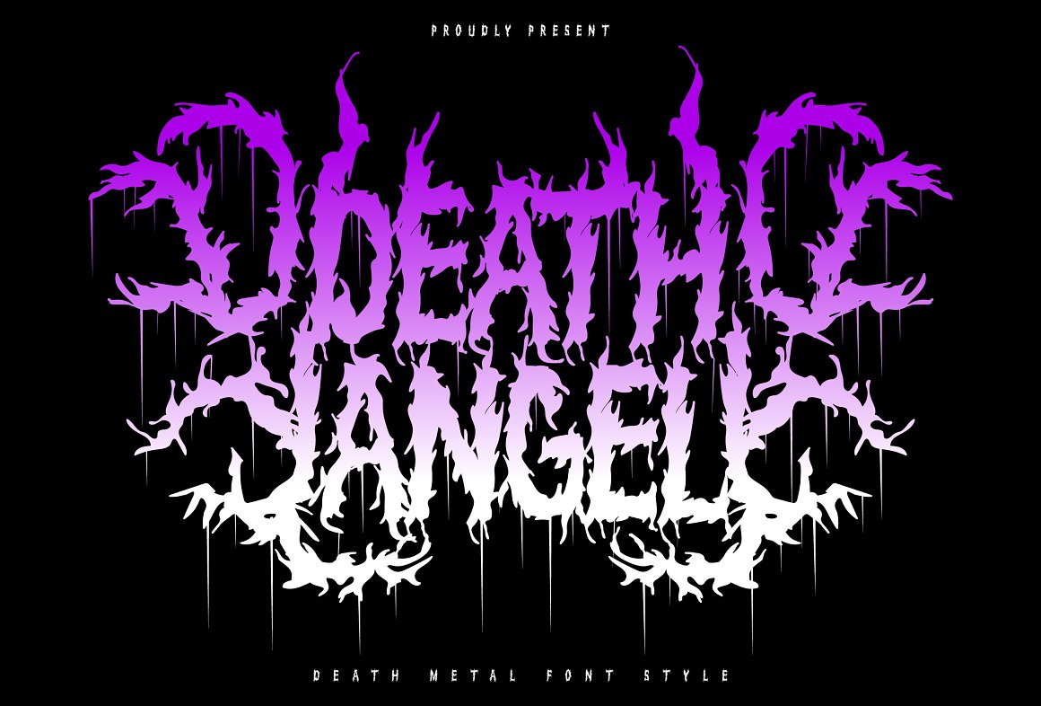 Death angel has a strong and aggressive look with crisp, sharp lines. This font has hard angles and leans slightly towards the vertical, giving it a sharp, scary feel. accompanied by additional ornaments that you can custom style yourself. can be applied like, t-shirt design, product design group name, quotation etc.