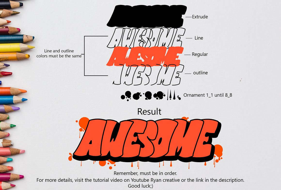 Hello creatives Introducing the Rustel Pocket inspired by graffiti style with throw ups style which has a unique appearance with additional variations of extrude, line, regular and outline lines. accompanied by additional ornaments that you can customize your own style. can be applied like, t-shirt design, sticker, image style etc.