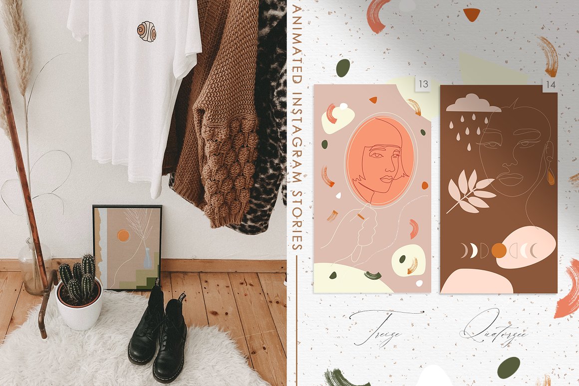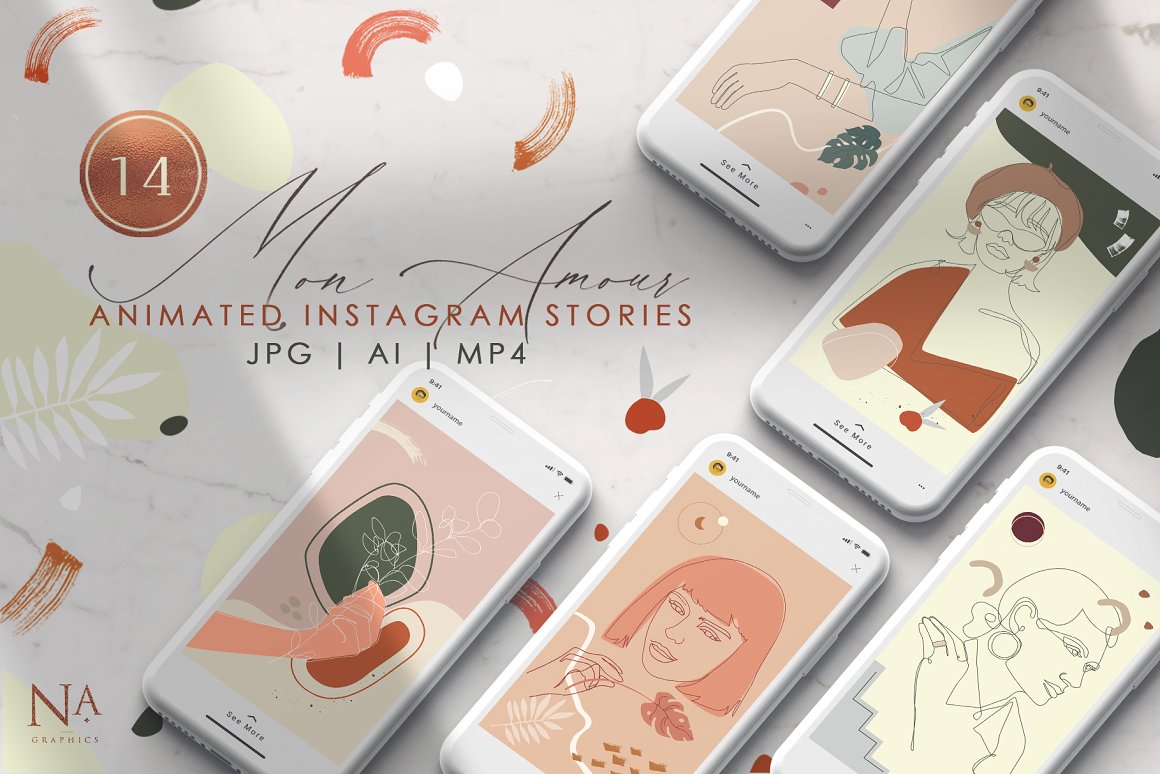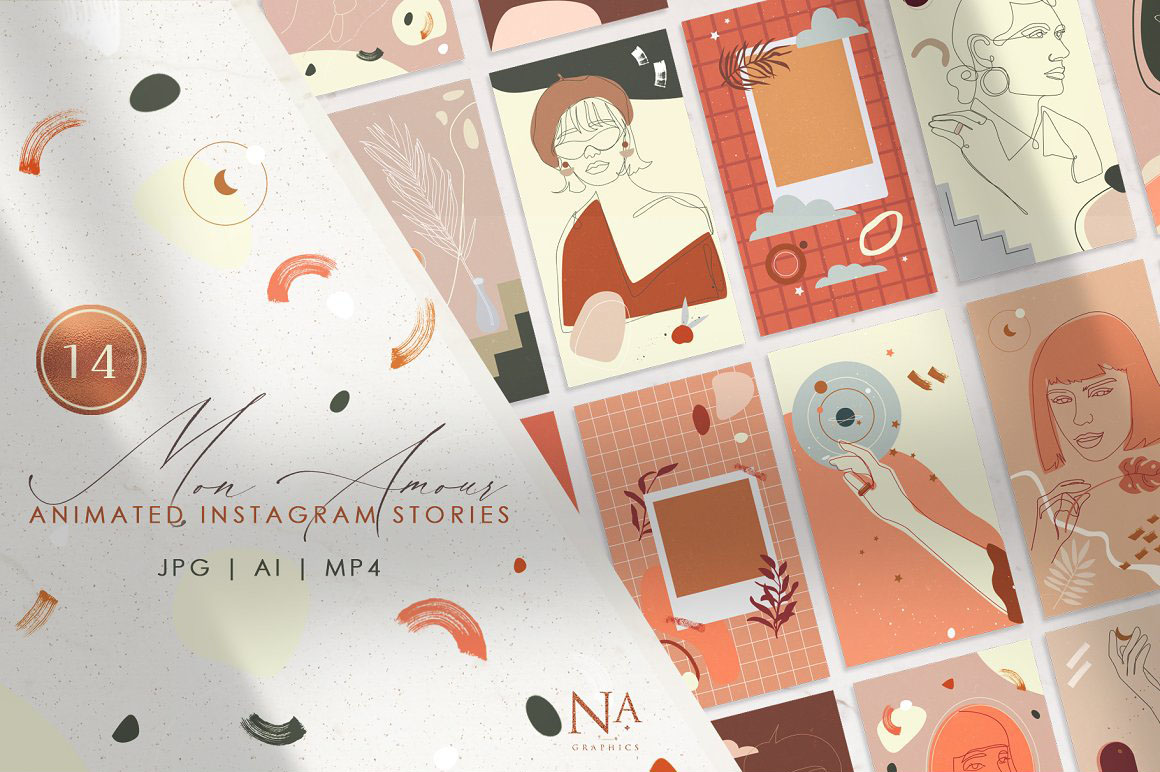 14 Mon Amour Animated Stories – 14 individual modern and abstract Instagram stories in ai, jpg and mp4. Fully Editable file format in vector – change colors and shapes. Use these templates to add modern and unique touch to your Instagram account. Ready-to-use and Print All format that you need for correction are included and video files MP4 for your Animated Instagram Stories.