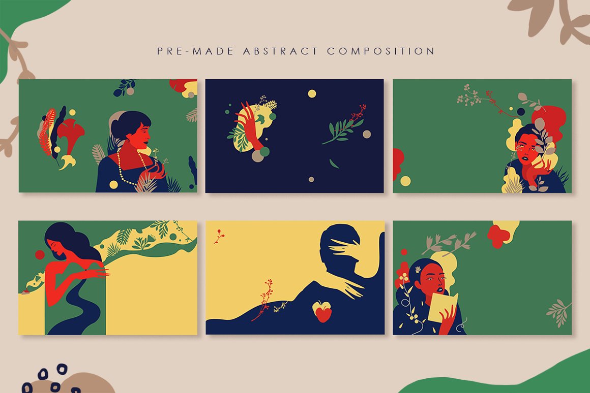 Abstractionism Graphic Set – This collection is a modern interpretation of abstract arts with different shapes and foliage elements. Included 12 pre-made abstract compositions. Vector and raster versions are included (ai/jpg/eps). Just create a unique design and get fun with all arts. You can change all the details and colors in vector programs. Mix and create contemporary bright design. Ideal for stationery, invitations, festival and conference branding, print design and all you want!