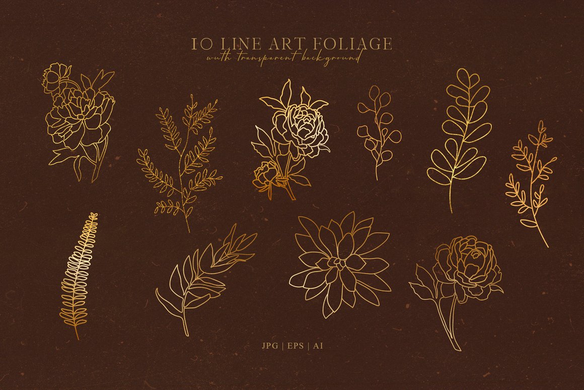 - 10 Line art foliage ( AI | PNG | EPS : 5000×5000 px, 300 dpi) in black and gold colors
