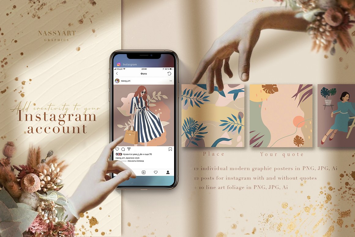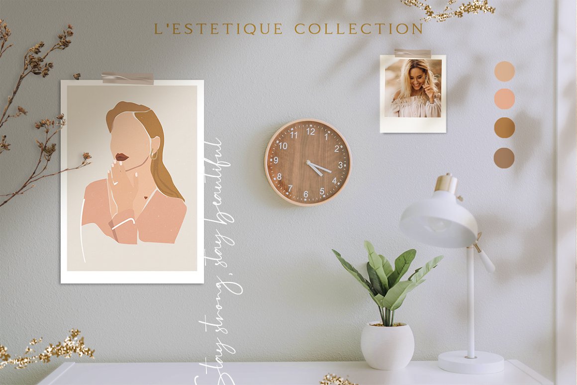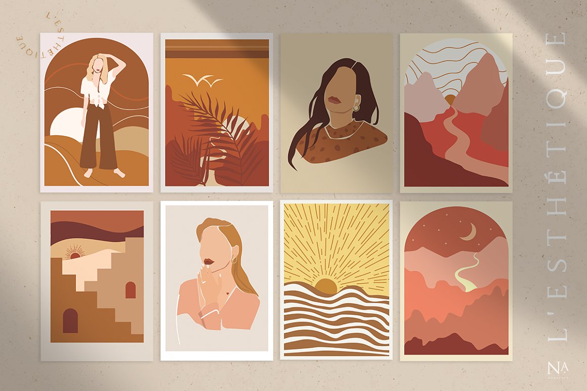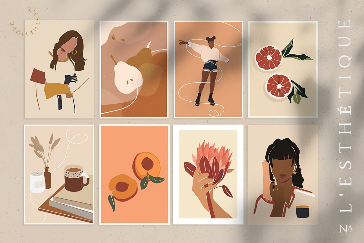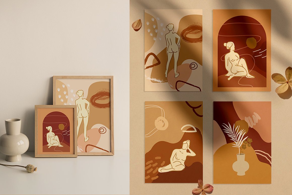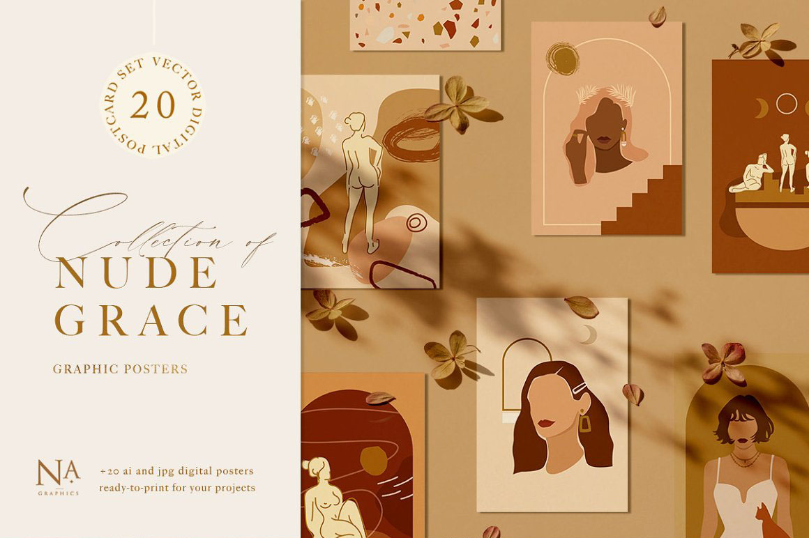 Nude Grace Modern Vector Set – Decorate your wall with this collection of modern&fashion postcards, use them for posts in Instagram and your projects. Use these elements to create your own unique Instagram account design or branding. You just need to select card and crop it, combine other provided items or add a quote on the empty space. And the personal card will be ready! In this pack, you can find a variety of fashionable arts and abstract modern illustrations. They are available to mix and match for design projects with endless composition combinations of all pieces. These elements are ideal for the creation of printed products: notebooks, invitations, personal postcards, branding identity and Instagram posts. Add these beautiful vector graphics to create your own interesting profile, branding style, send cards to your best friends, present for someone important or decorate your working place with the wall posters.