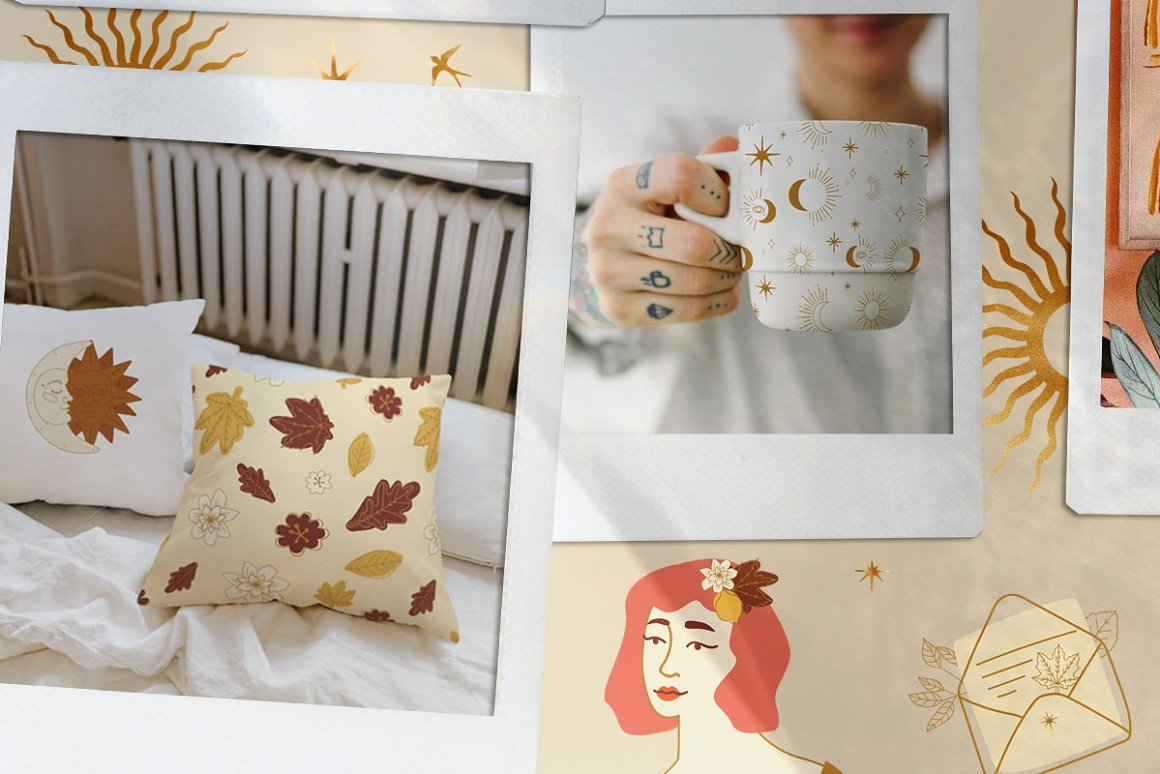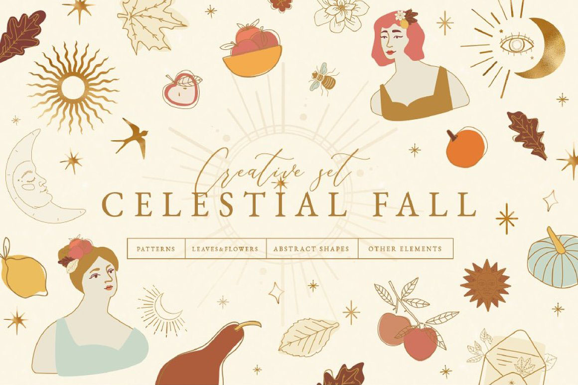 Celestial Fall Abstract Set – Create creative branding with this autumn mood set of colorful abstract shapes and pre-made illustrations. This pack contains pre-made objects such as leaves and flowers, seamless patterns, highlights for Instagram, cards, celestial elements and isolated creative abstract shapes. Use these elements to create your own unique branding design. You just need to select an element, combine other provided items and сhose a pattern or background. And your project will be ready! In this set, you can find a variety of line illustrations, modern abstract forms and patterns. They are available to mix and match for design projects with endless composition combinations of all pieces. These elements are ideal for the creation of printed products: notebooks, invitations, wallpaper, wrapping paper, textiles and design of your inst account or web site. Add these beautiful vector graphics and patterns to create your own brand or diversify of your Instagram tape.