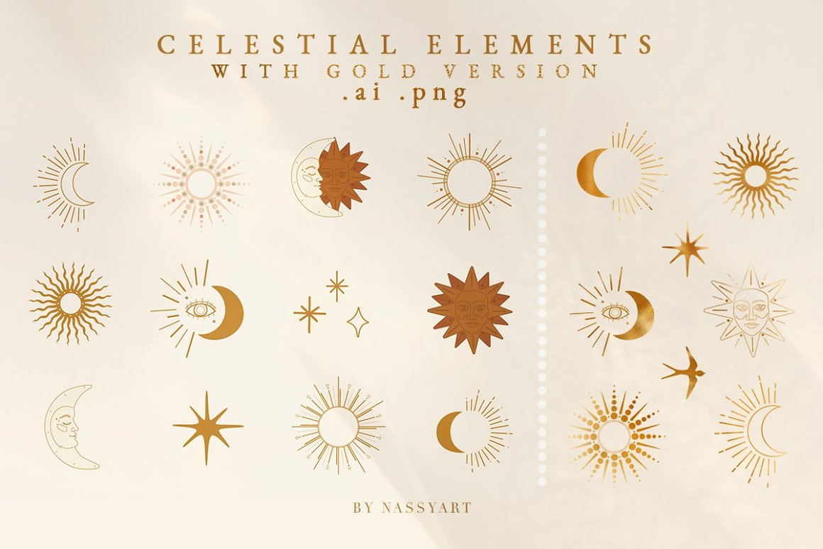 - 29 Celestial Elements (PNG: 5000×5000 px, AI, 300 dpi) – 14 gold and 15 colorful elements