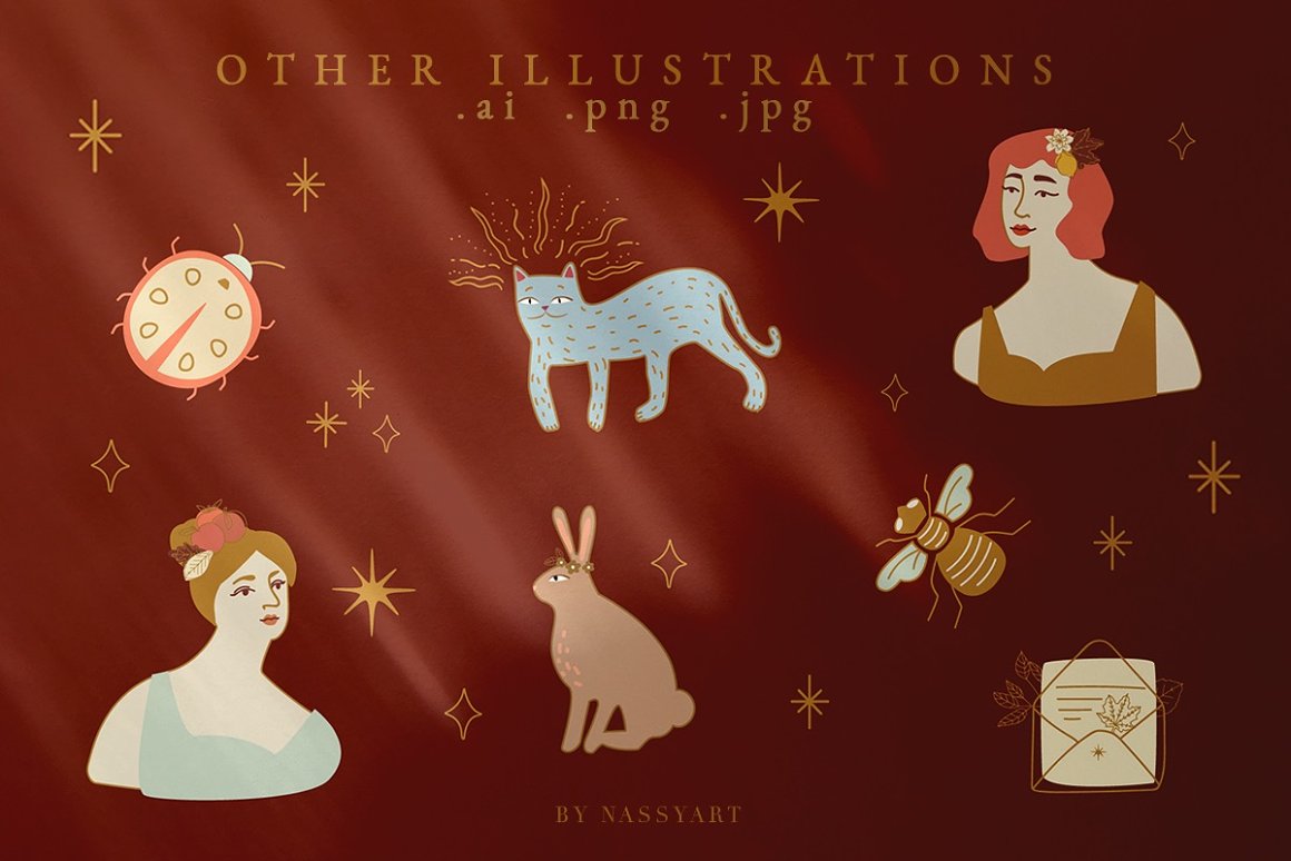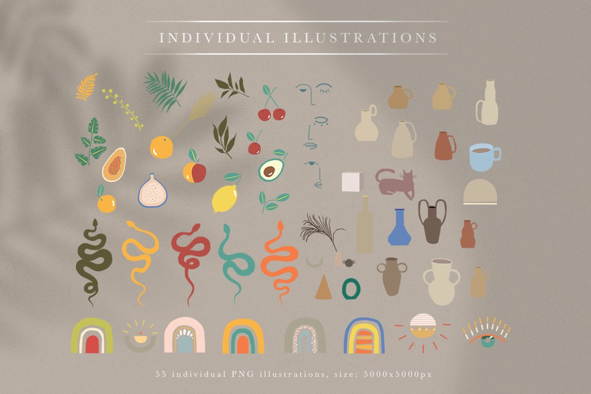 This new & exclusive bundle contains 1010 different elements, backgrounds, patterns, alphabets, individual illustrations, postcards, posters, Instagram templates, clip arts etc. They are perfect for your small business, branding, paper stationery, clothing, accessories, invitations, packaging, childish books, magazines and more.