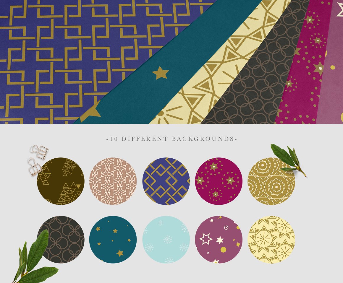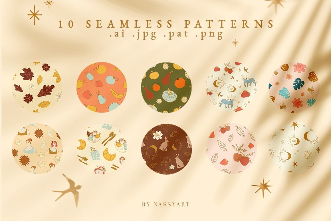 - 10 Backgrounds from seamless patterns (saved as JPG and Ai, 300 dpi with 6000×4000 px size)
