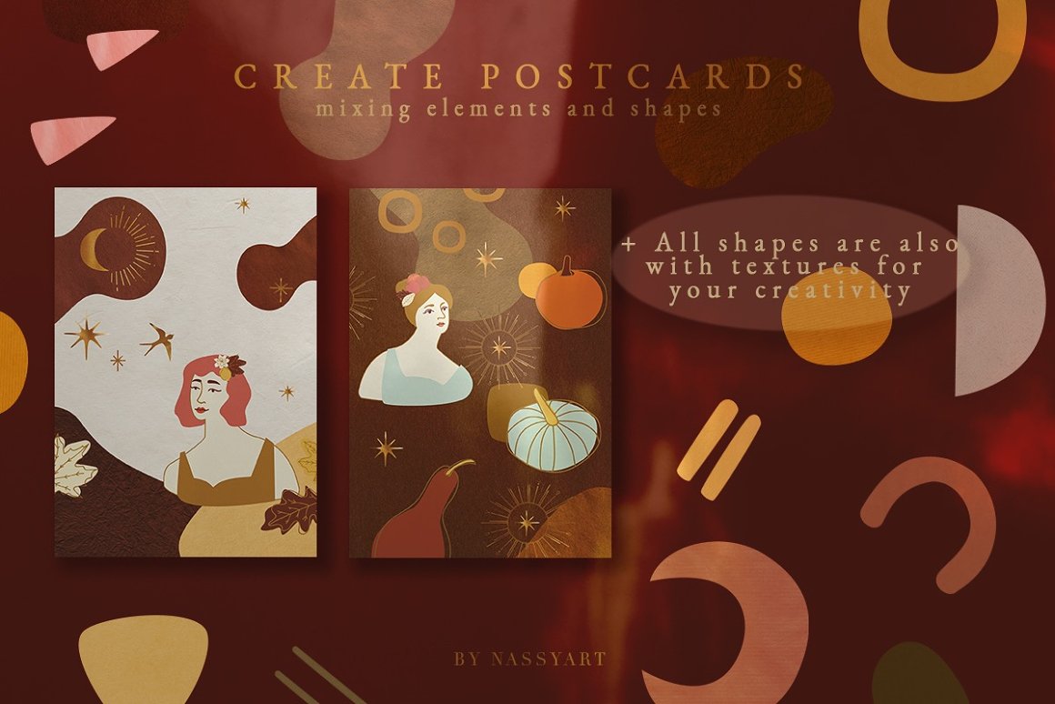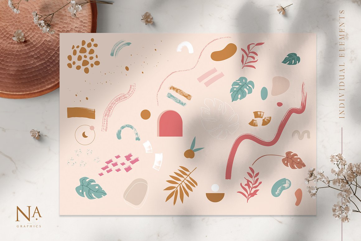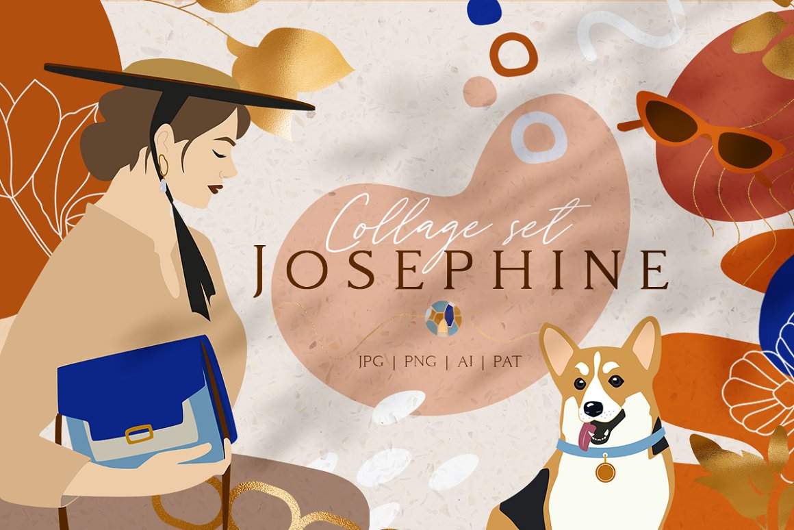 Josephine Collage Set – Create magical branding with this set of colorful abstract shapes and elements that contain pre-made objects, such as: illustrations, seamless patterns, artboards, isolated creative abstract shapes and backgrounds for instagram. Use these elements to create your own unique branding design. You just need to select an element, combine other provided items and сhoose a pattern or background. And branding will be ready! In this pack, you can find a variety of color artboards and patterns. They are available to mix and match for design projects with endless composition combinations of all pieces. Be sure to click on the image to see all elements. These elements are ideal for the creation of printed products: notebooks, invitations, wallpaper, wrapping paper and textiles. Add this beautiful vector graphics and patterns to create your own brand. Create your own unique collage!