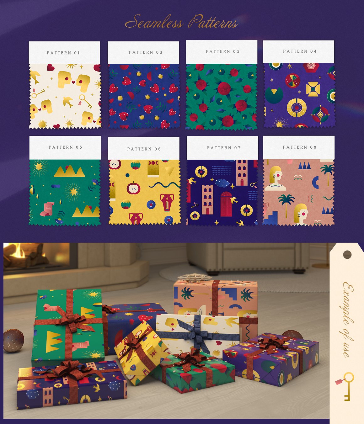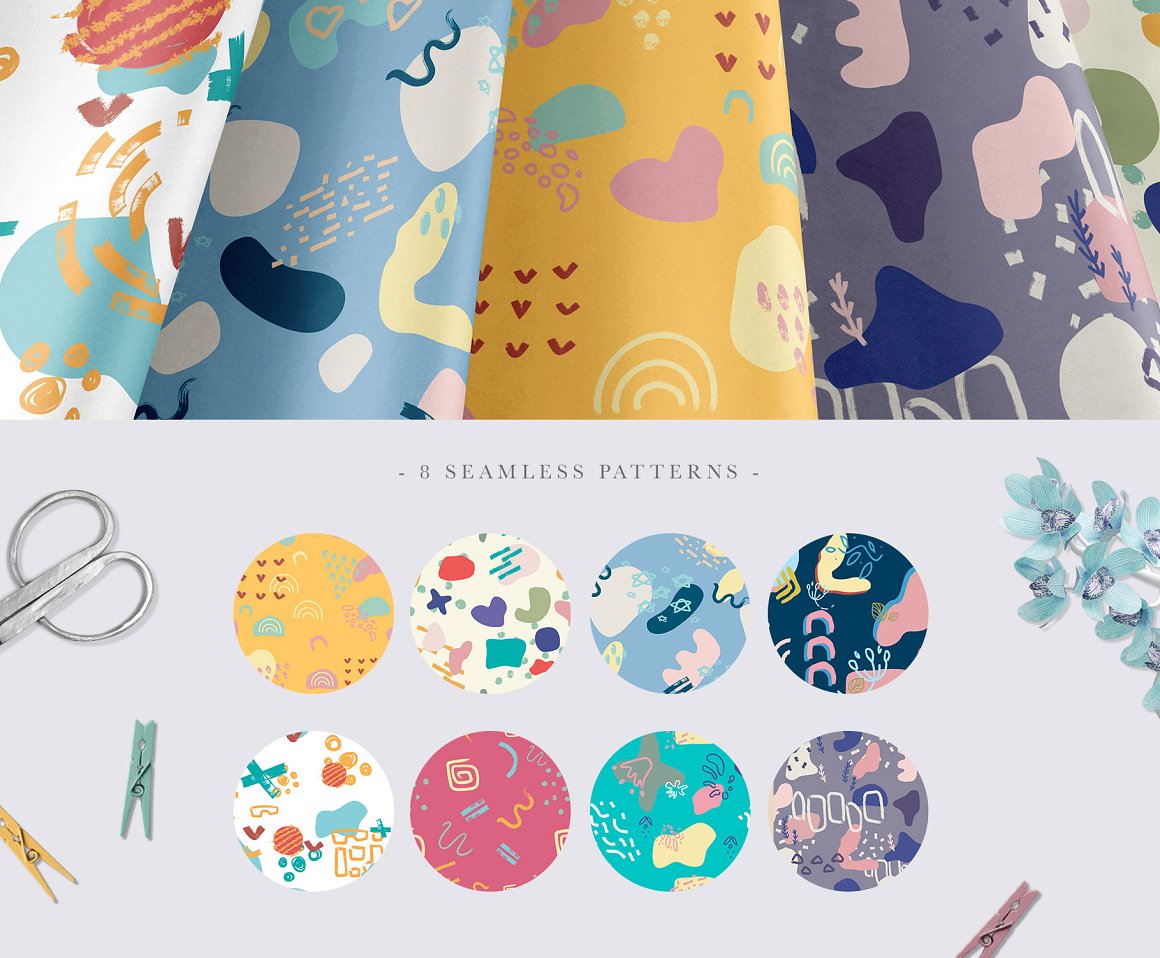 - 8 Backgrounds from seamless patterns (saved as JPG and Ai, 300 dpi with 6000×4000 px size)