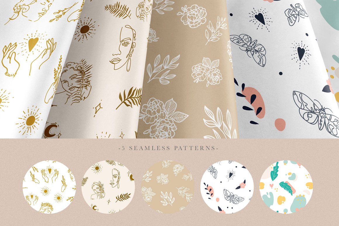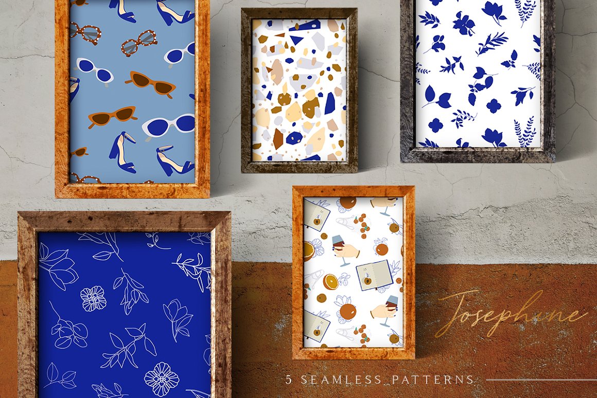 - 5 Backgrounds from seamless patterns (saved as JPG and Ai, 300 dpi with 6000×4000 px size)