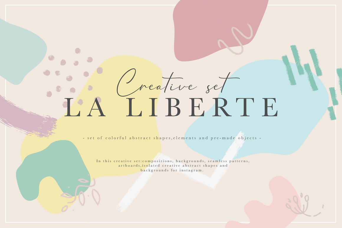 La Liberte – Create magical branding with this set of colorful abstract shapes and elements that contain pre-made objects, such as: compositions, backgrounds, seamless patterns, artboards, isolated creative abstract shapes and backgrounds for instagram. Use these elements to create your own unique branding design. You just need to select an element, combine other provided items and сhoose a pattern or background. And branding will be ready! In this pack, you can find a variety of color artboards and patterns. They are available to mix and match for design projects with endless composition combinations of all pieces. Be sure to click on the image to see all elements. These elements are ideal for the creation of printed products: notebooks, invitations, wallpaper, wrapping paper and textiles. Add this beautiful vector graphics and patterns to create your own brand. As for pleasant bonus use instagram templates to add more creativity on your profile!