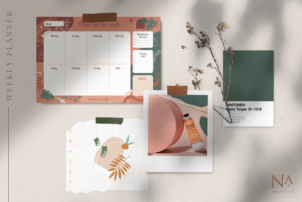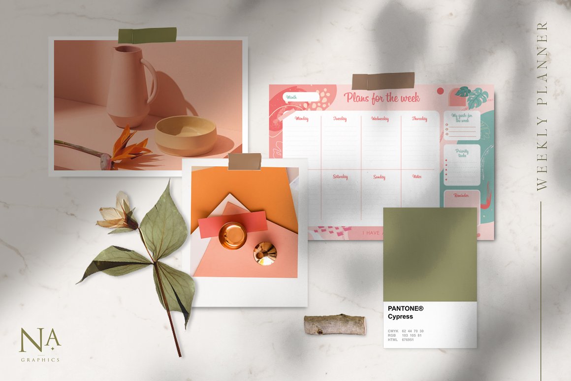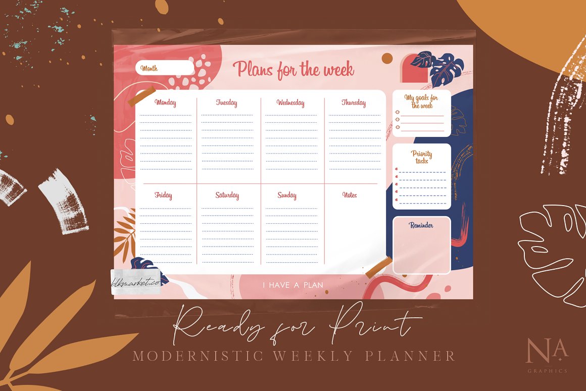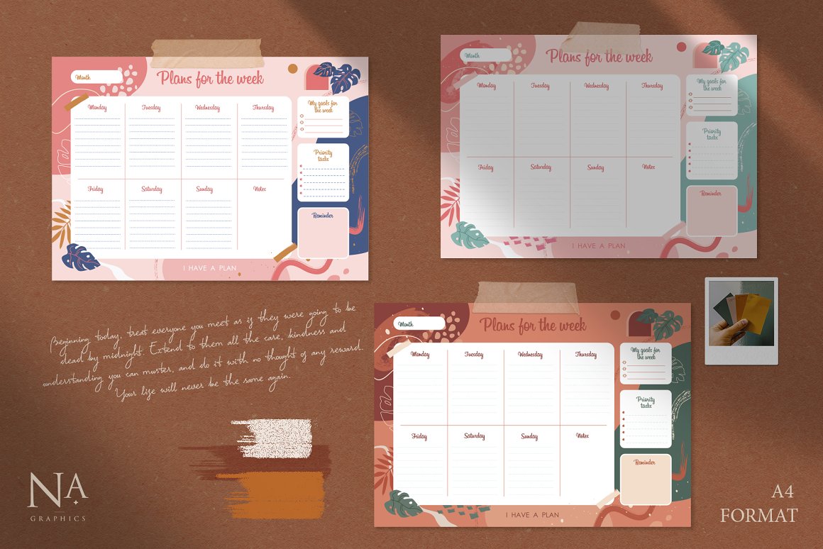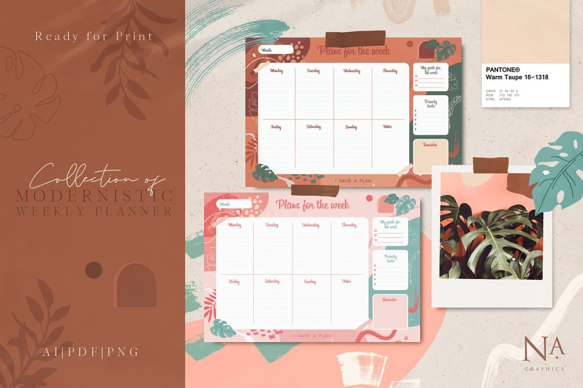Modernistic Weekly Planner – three individual weekly planners with different color palette and 33 isolated png abstract elements. All planners are in Ai and PDF (A4 format) and ready to print! You can use it for your weekly plans or print it for sale with the Commercial License. Planners are in vector and ready to edit. Choose elements you like and change illustration in the way you like or change color shades.