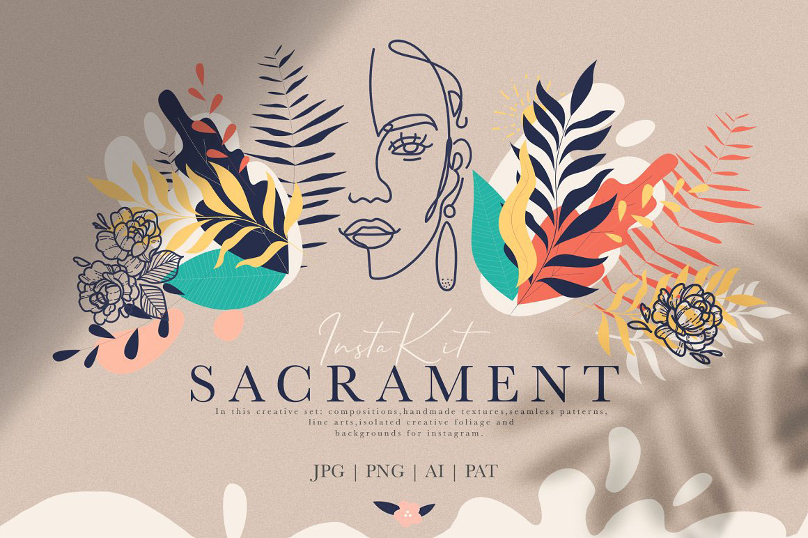 Line Art Abstract Insta Logo Kit – Create mysterious branding with this kit of colorful abstract shapes and line art elements that contain pre-made objects, such as foliage, handmade and digital backgrounds for instagram, seamless patterns and isolated creative abstract shapes. Use these elements to create your own unique branding design. You just need to select an element, combine other provided items and сhoose a pattern or background. And branding will be ready! In this pack, you can find a variety of line illustrations, modern abstract forms and patterns. They are available to mix and match for design projects with endless composition combinations of all pieces. These elements are ideal for the creation of printed products: notebooks, invitations, wallpaper, wrapping paper, textiles and design of your inst account or web site. Add this beautiful vector graphics and patterns to create your own brand or diversify of your instagram tape.
