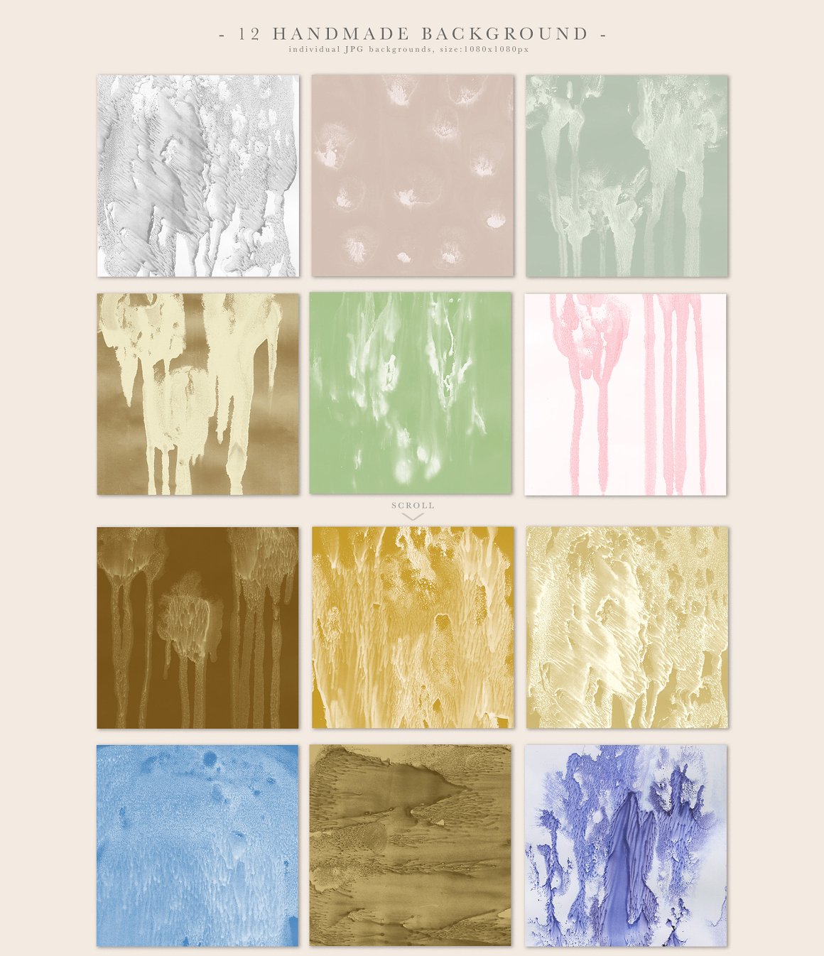 - 12 Handmade Square Textures (JPG: 1080×1080 px, 300 dpi)