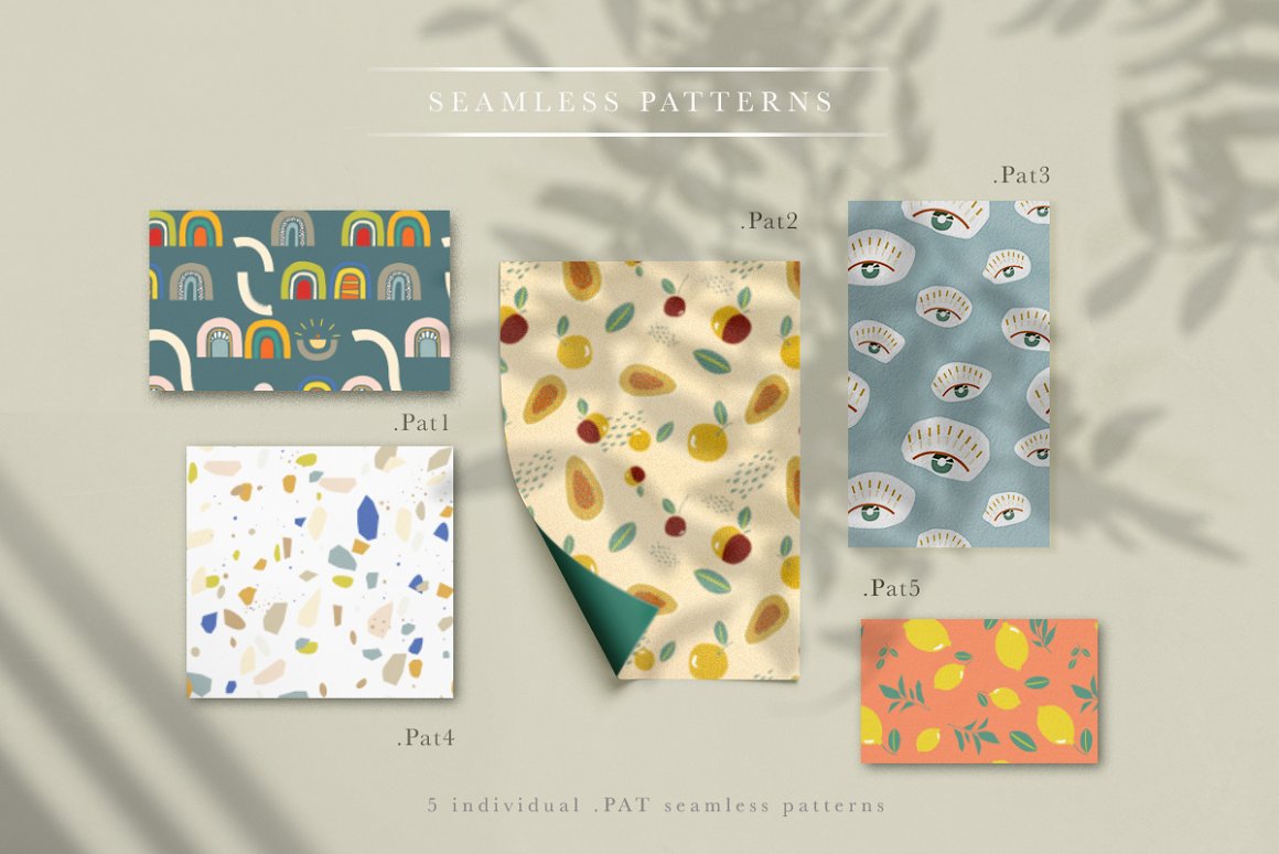 - 5 Photoshop seamless patterns (.pat, ai) – 1500x1500px base size, you can create very high-resolution patterns)