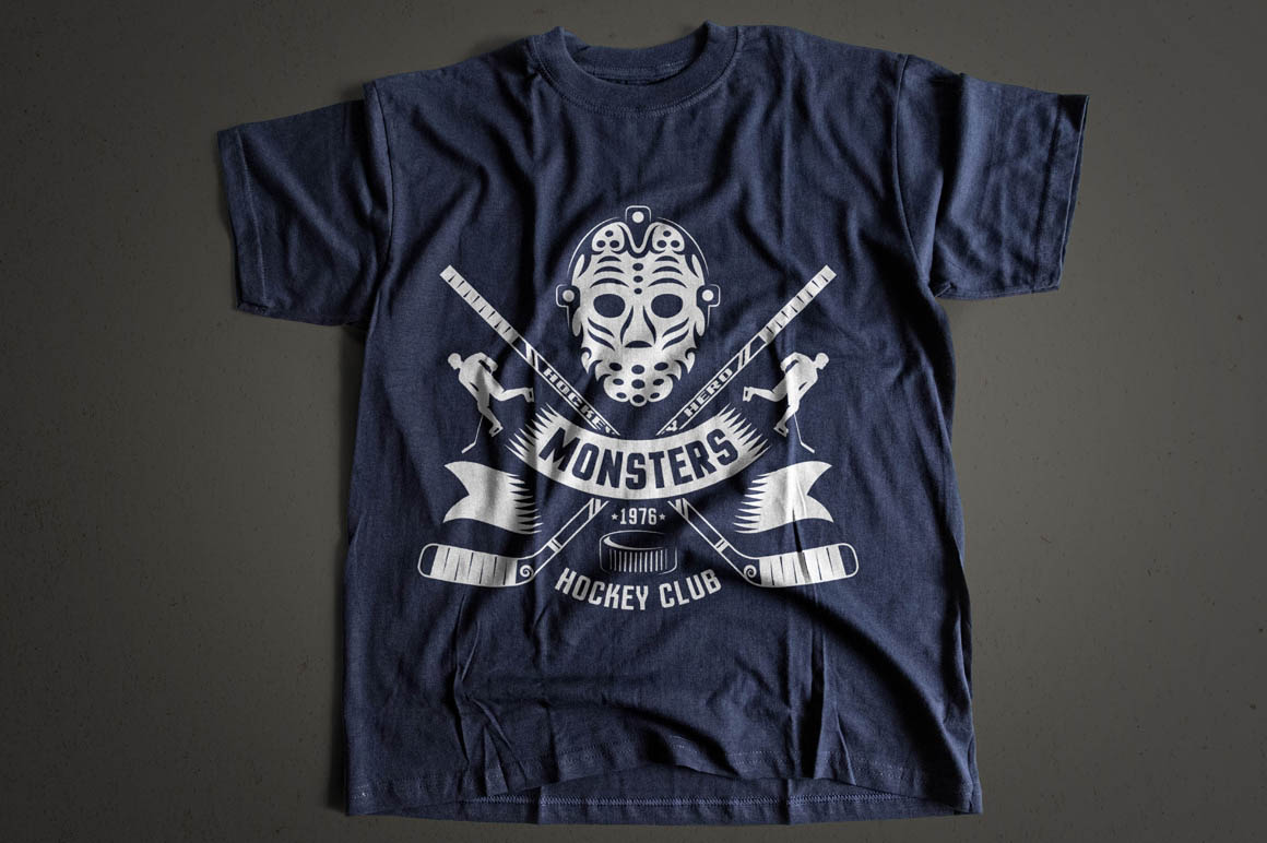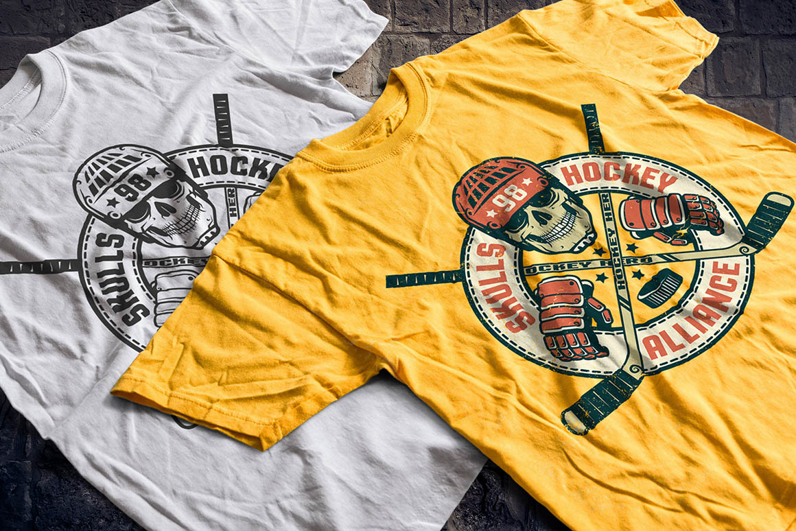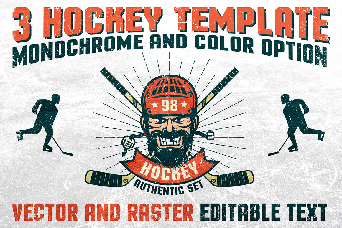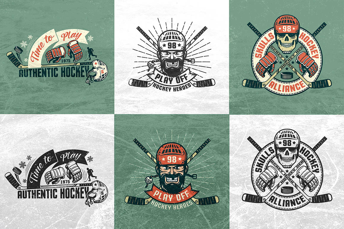 - 3 hockey retro emblems in 2 options – monochrome and color. Vector AI CS6, EPS10 and raster layered PSD, JPG files. AI CS6 and PSD files with editable text.