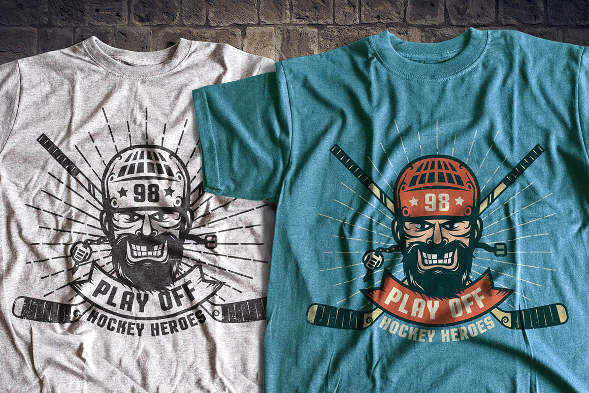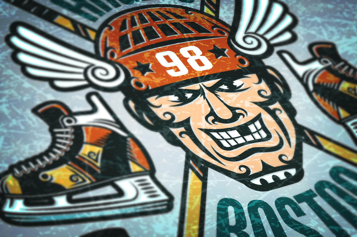 Amazing retro logos for hockey team, hockey club or just print on the T-shirt. Old-school-style head of hockey player without beard and with beard in a retro helmet blends perfectly with other hockey elements and and emphasizes the authentic hockey spirit of these logos.. Specially for you included versions with editable text in vector and raster, so that you can easily adapt the logo for you.