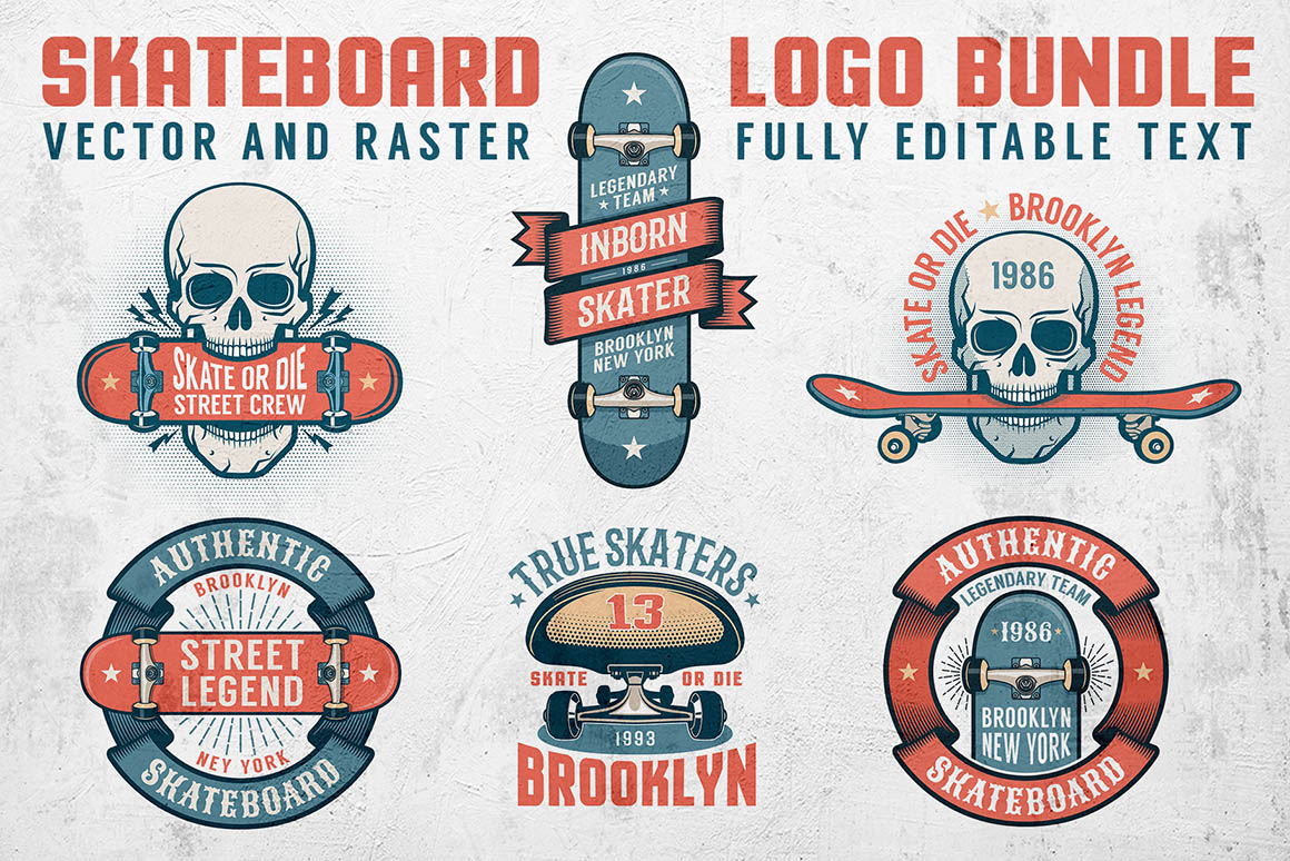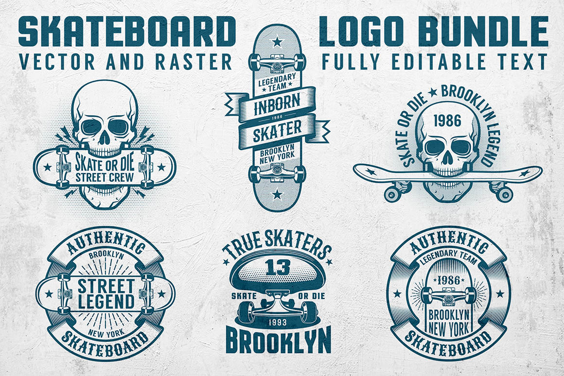 - 6 ready skateboard logo – monochrome and colored. Vector AI CS6, EPS10 and raster layered PSD, JPG files. AI CS6 and PSD files with editable text.
