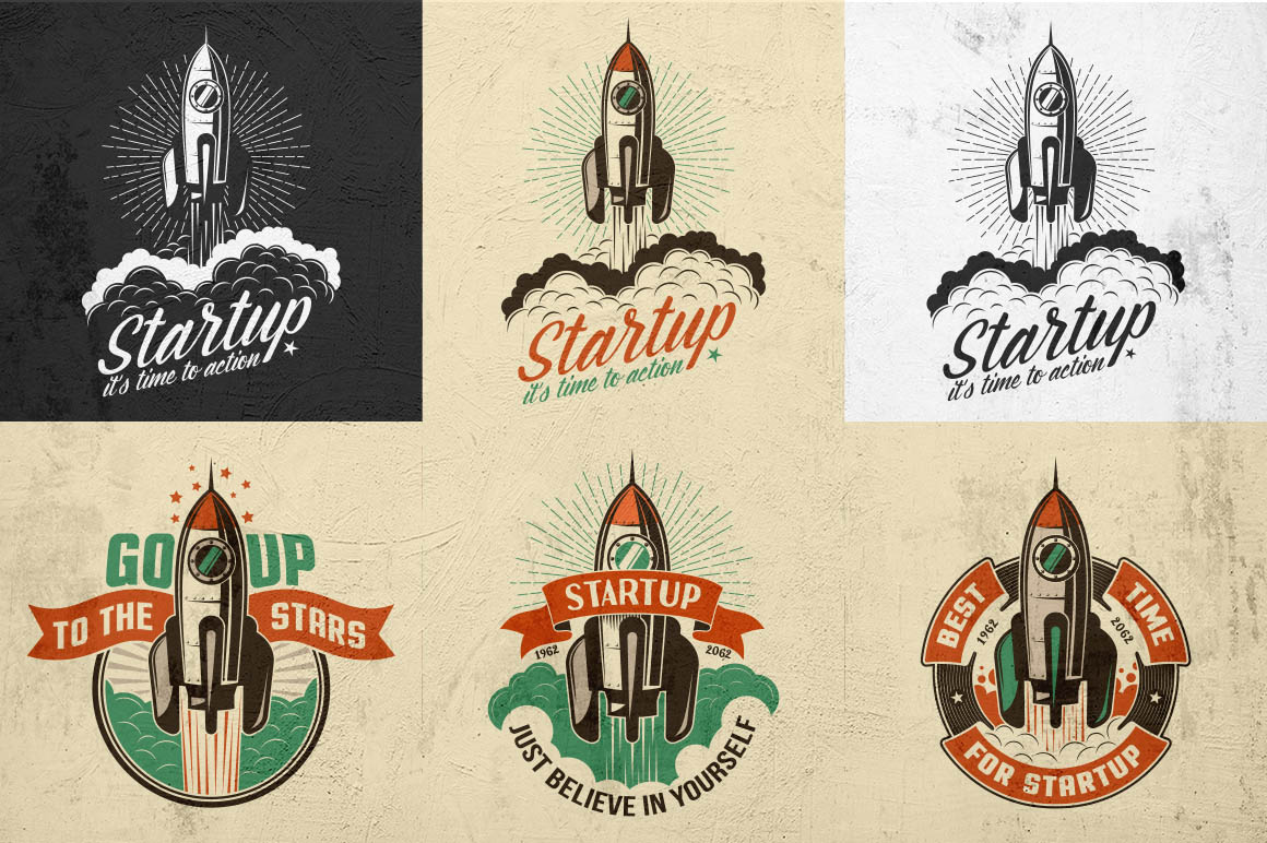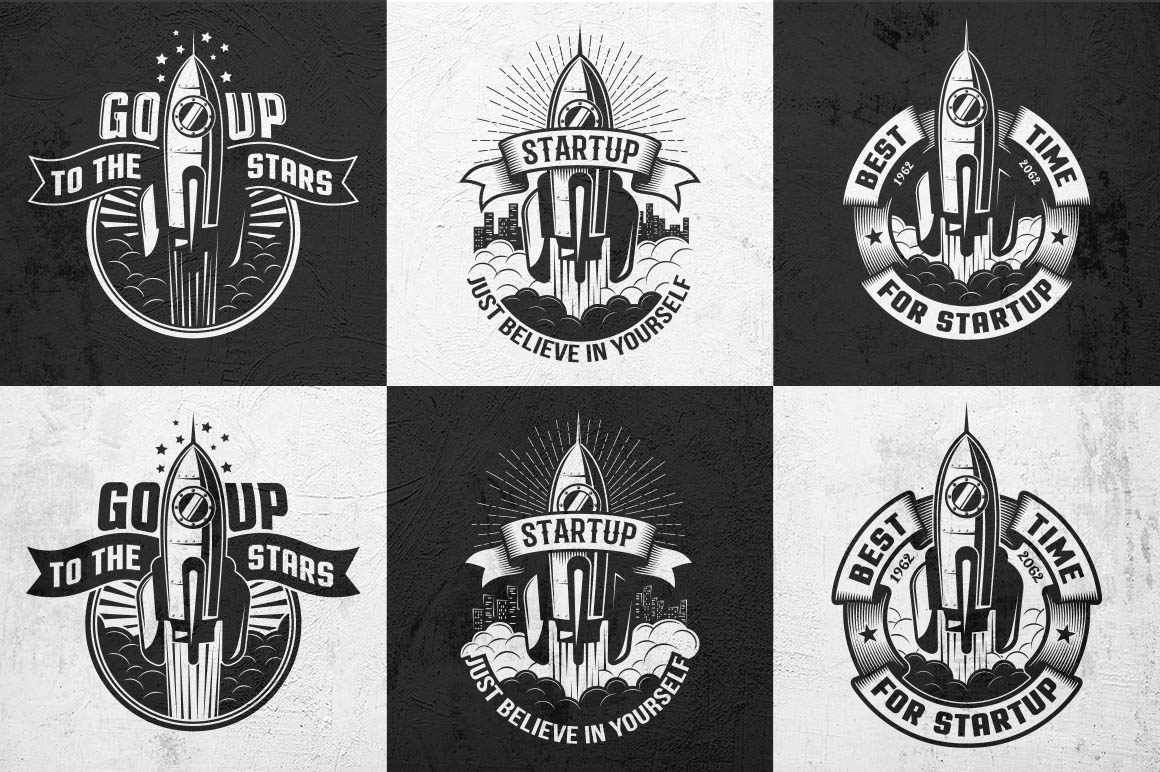 Set of startup logos with a rocket in retro style. Variants for a dark and light background are presented, which greatly extends the application possibilities.