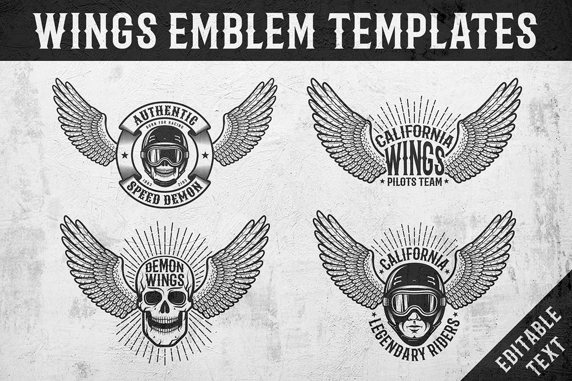 - 4 ready emblems with wings. Vector AI CS6, EPS10 and raster layered PSD, JPG files. AI CS6 and PSD files with editable text.