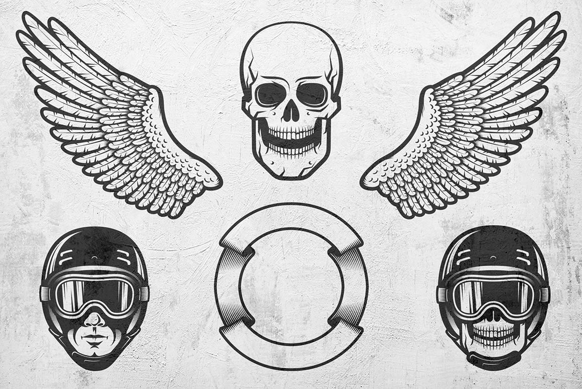 An excellent set of emblems with wings, head in helmet, skull and editable text. Good for racers, pilots, bikers and all that. Just replace the text with the one you need and enjoy!