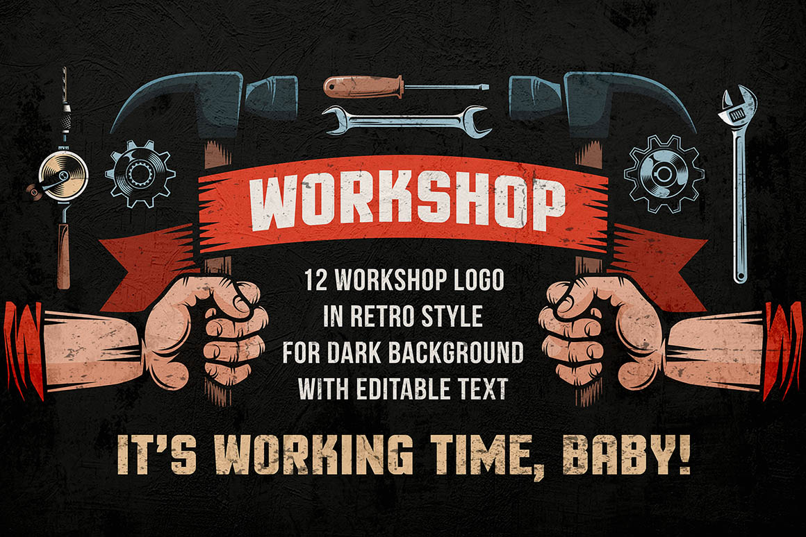 - 12 workshop logos with editable text – vector AI, EPS, raster PSD files. Note! In some logos, fonts have been changed for the version with editable text! See the preview!