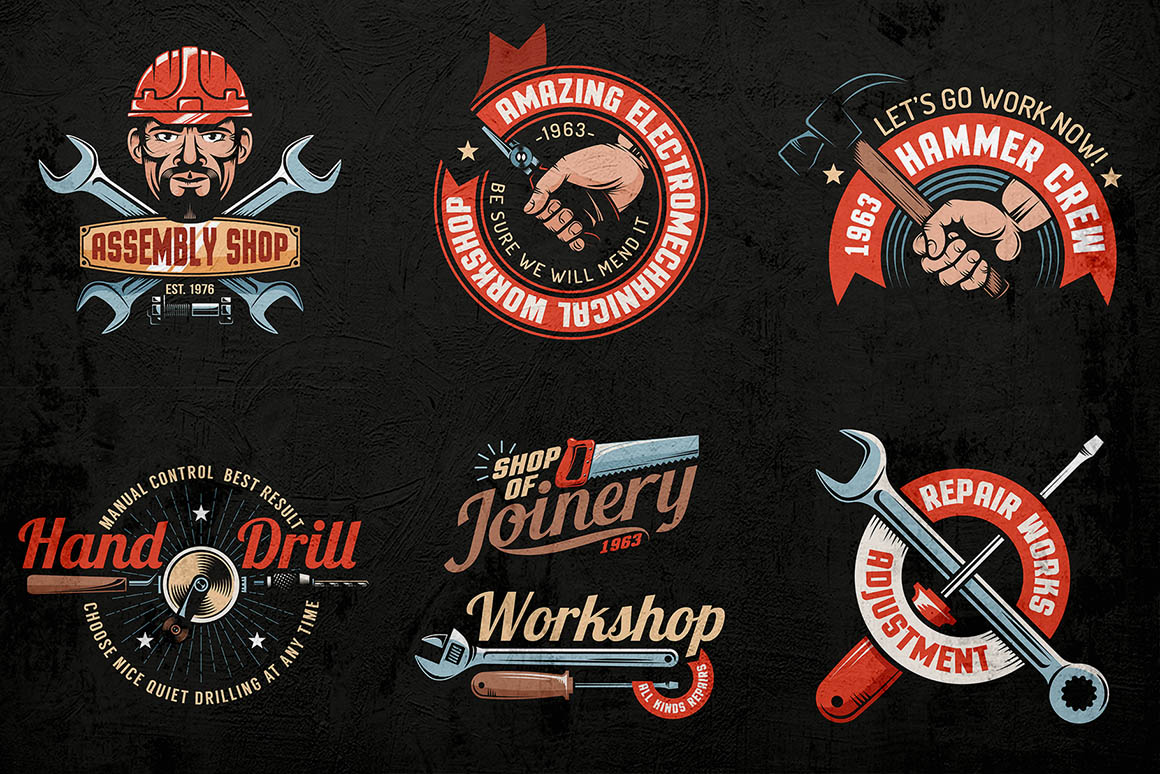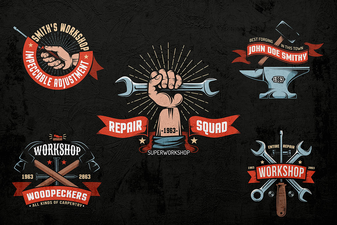 Amazing workshop bundle of tools, hands and logos in vintage style. Perfect for placing on any surface. You can use ready-made logos, edit them, or design your own!