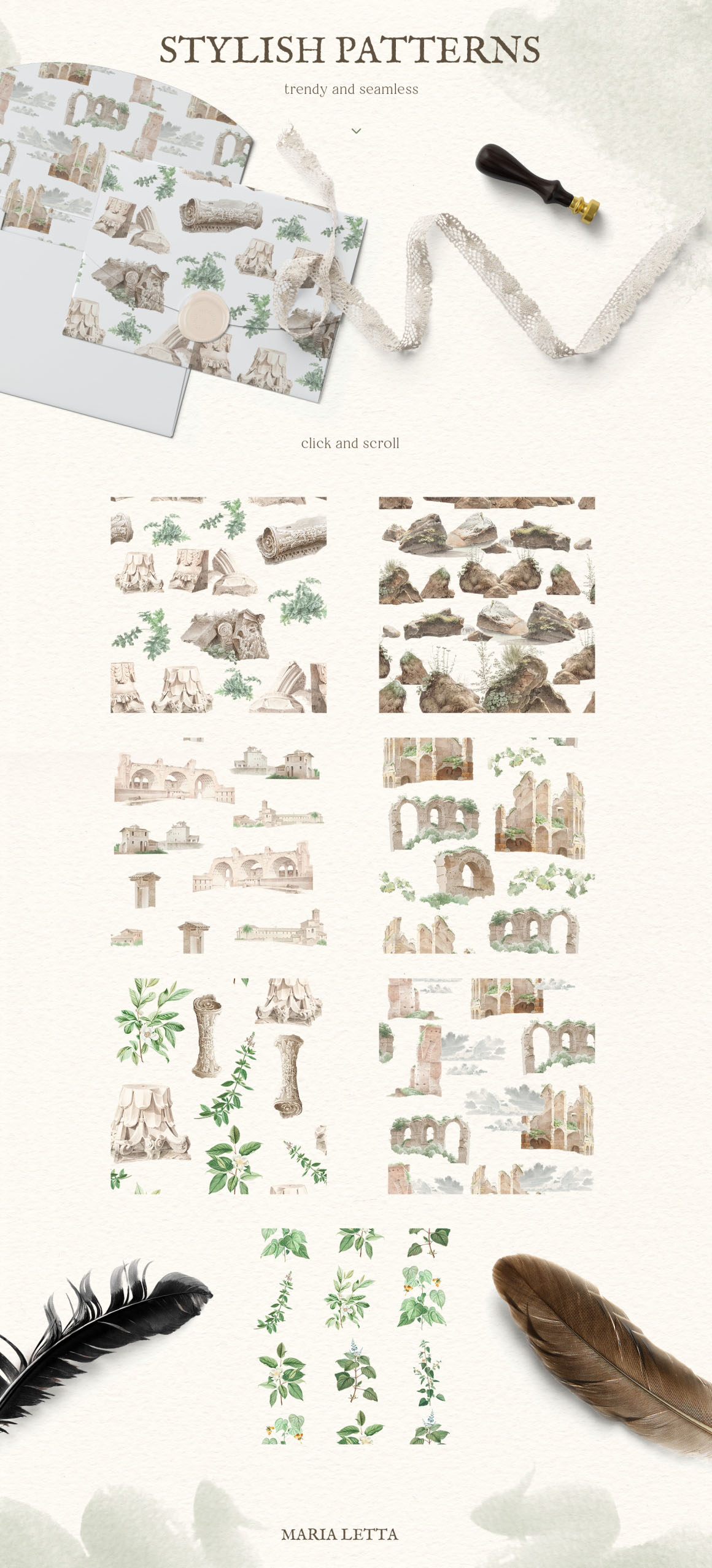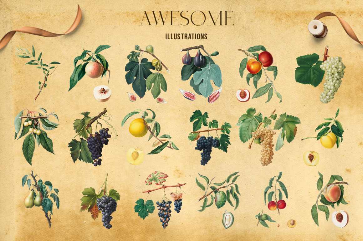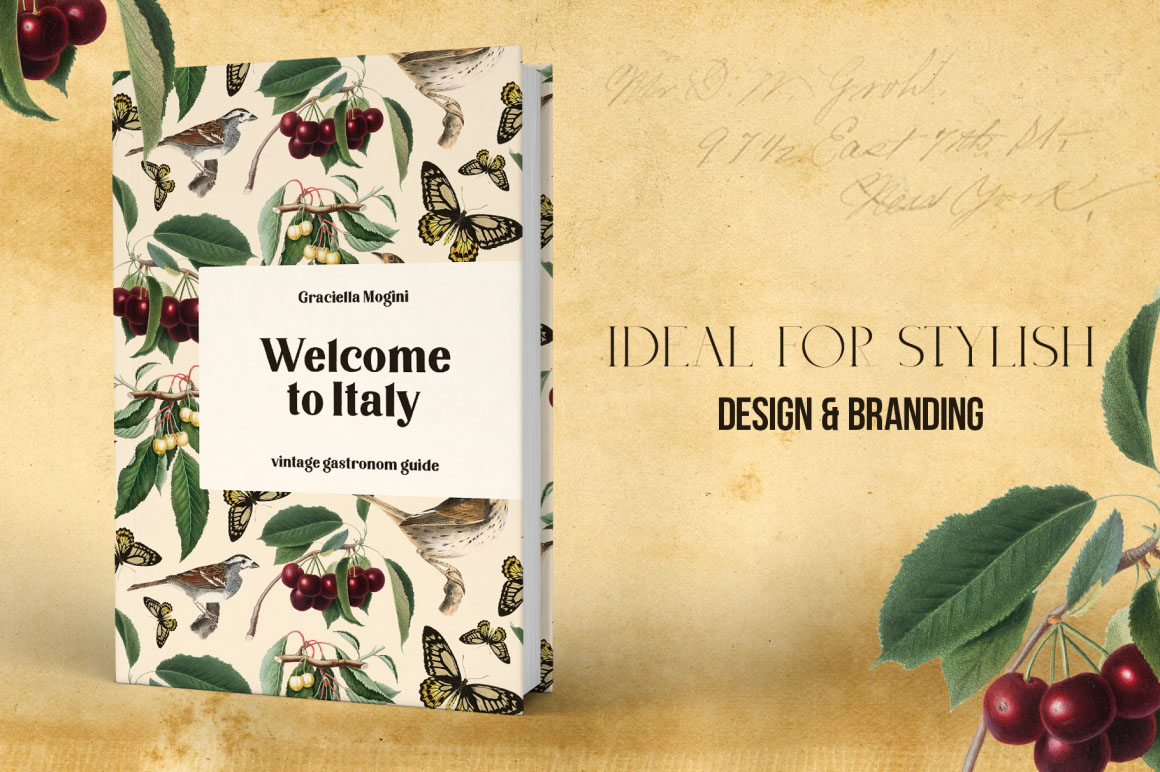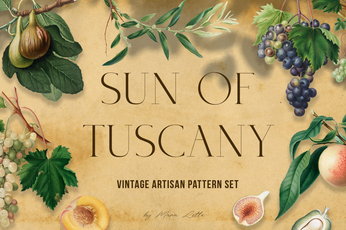 Introducing the Sun Of Tuscany vintage design collection with stylish seamless patterns and separate illustrations. Use this amazing collection for wall art, wallpapers, posters, greeting cards, invitations, logo, branding identity, modern wedding suite and stationery, scrapbooking projects, gift wrapping paper, textile design, unusual advertising, social media accounts promotion (Instagram, Pinterest), Etsy, cosmetic lines, packaging design, design for blogs, wevb, banners, and infinity number of cases. I’ve taken old vintage illustrations from old books and manually removed the background from each picture with the pen tool for clean edges that would look great on both light and dark backgrounds.
