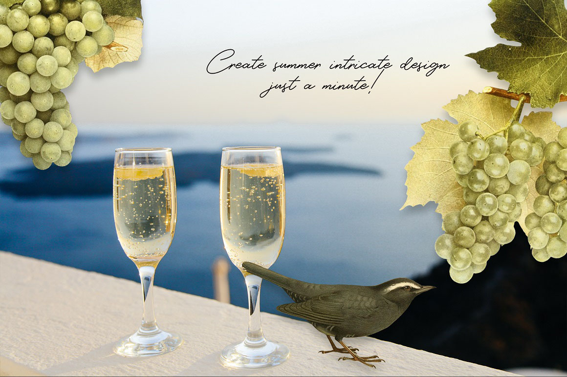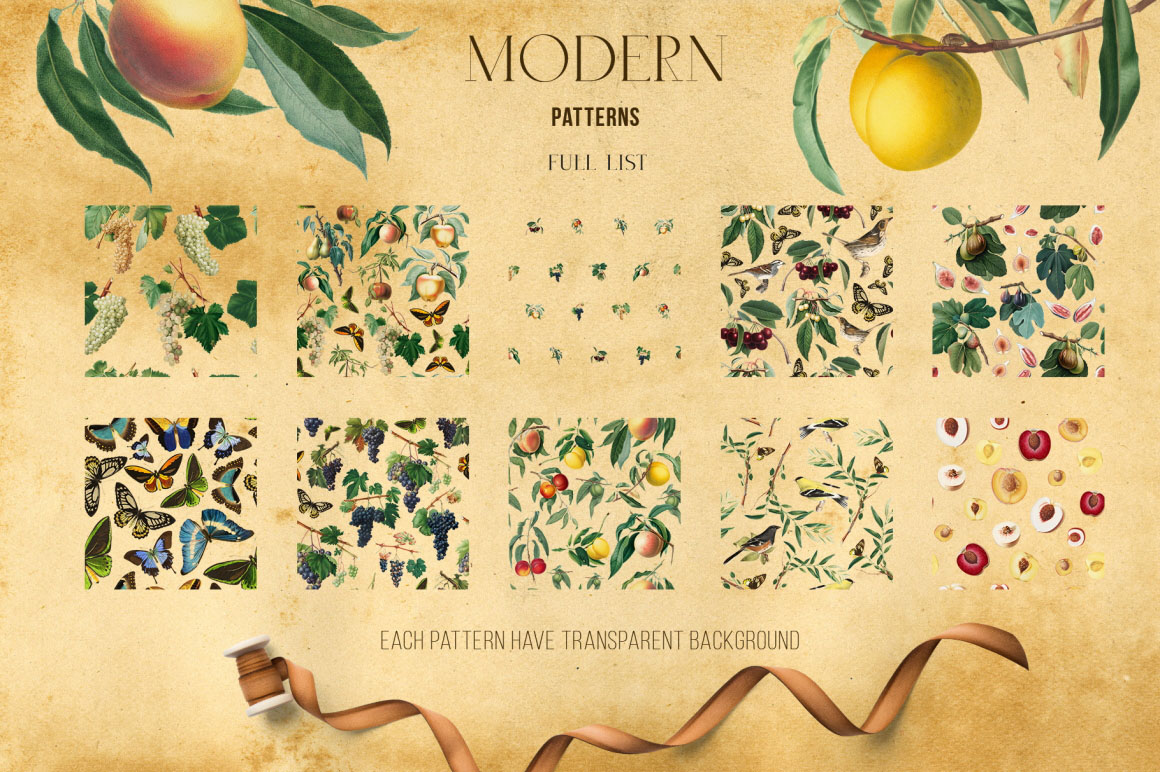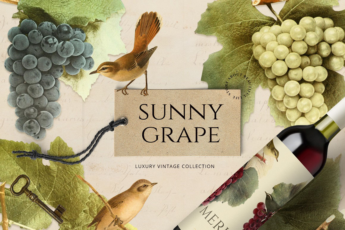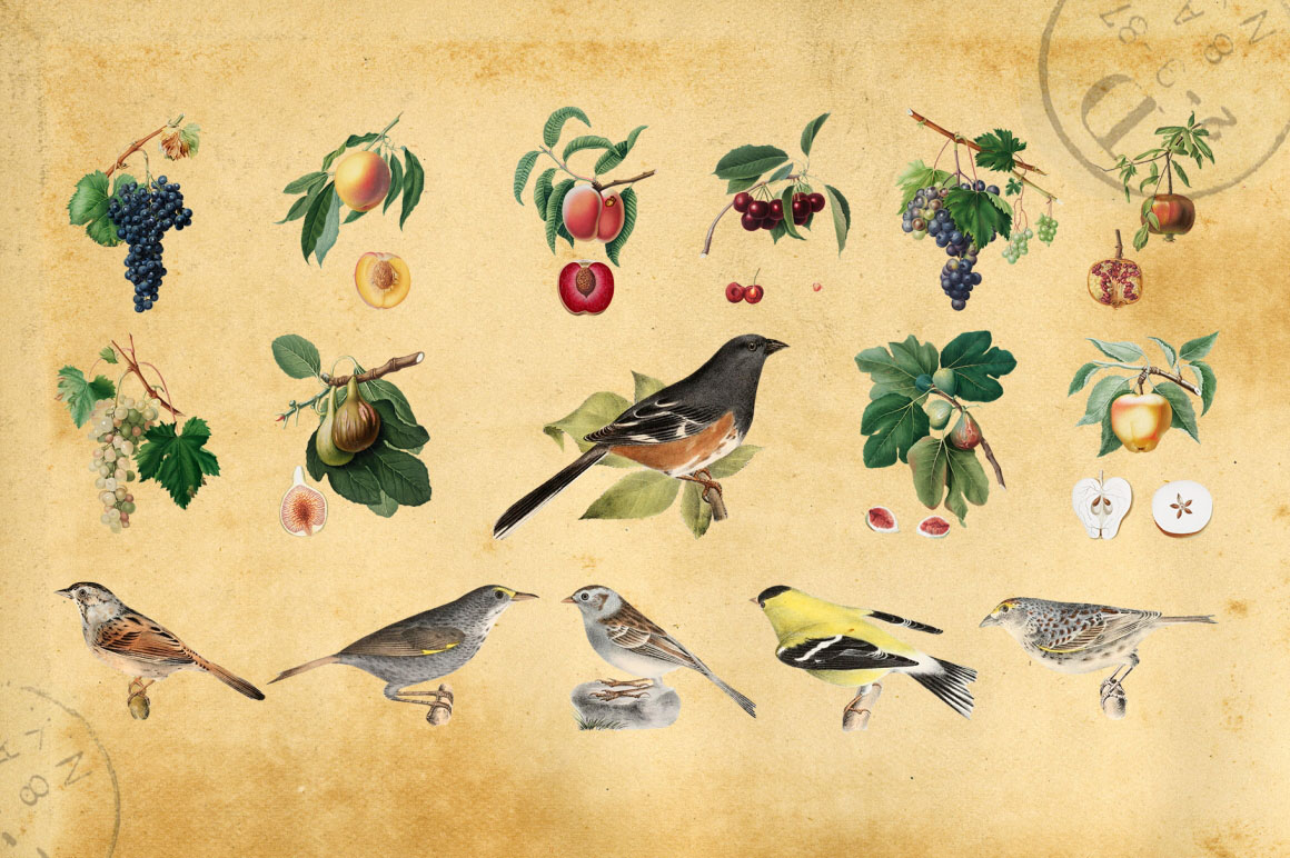 Sunny collection of hi-res PNG transparent images were carefully crafted from vintage botanical books. Different sorts of grape and little cute birds ideal for homemade wine and not only. A note about public domain usage: The original images are in the public domain under the laws of the United States. Public domain is a designation for content that is not protected by any copyright law or other restriction and may be freely copied, shared, altered and republished by anyone. I’ve manually removed the background from each picture with the pen tool for clean edges that would look great on both light and dark backgrounds. Perfect for art prints, wedding invitations, posters, packaging, brand design, social media, collages, web design, scrapbooking and more. Also I prepared 5 seamless patterns for your design ideas.