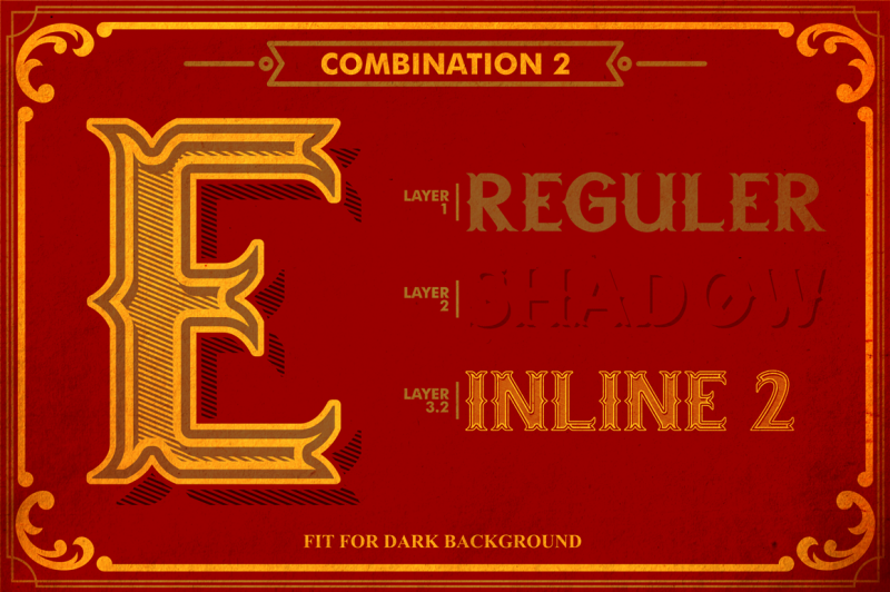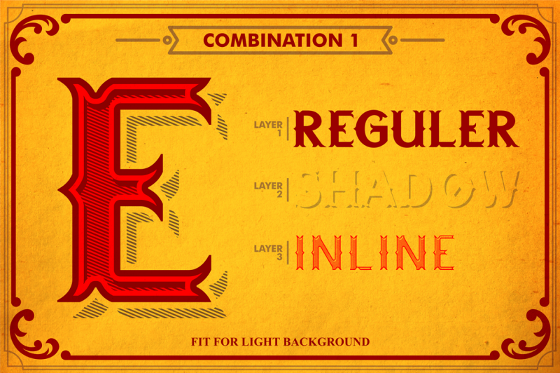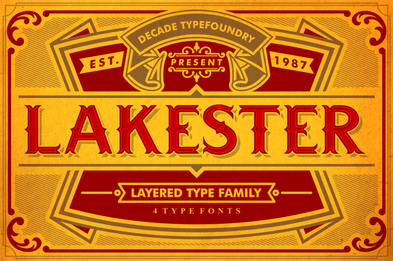 Lakester is a layered type family. Comes with 4 font system that can be layered to create different effect (regular,shadow,inline,inline 2). Inspired by vintage american west poster, loaded with 300 glyphs. This family best for logotype, gig poster, letterhead, dropcap, titles, and any artworks.