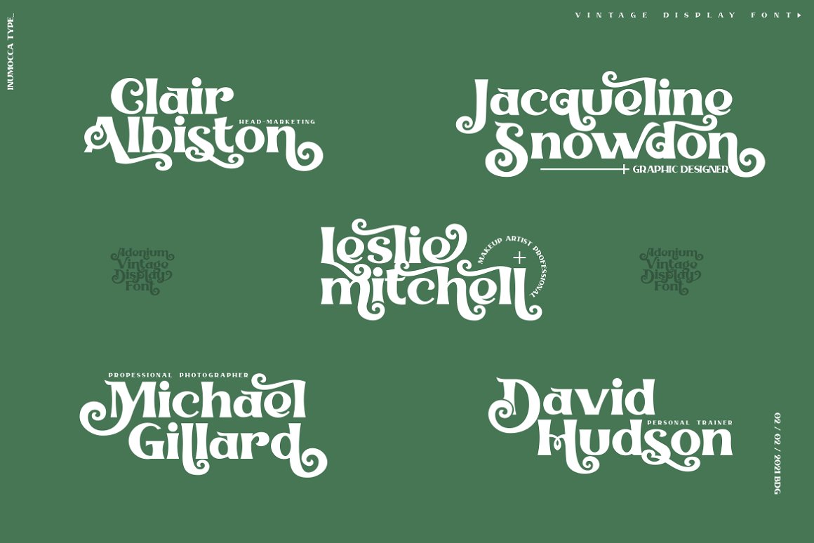 Adenium Typeface inspired by the Shape of the Adenium Tree, Vintage Display typeface , Classic Taste with some Curly and Curved its Great flexible typeface. unique Stylictic Set and Beautiful Ligature, Really playful typeface to covering your Project, like Lettering, Website Interface, Bookcover or Book Content, Magazine cover, Branding, Poster, wedding invitations, Quotes Lettering, Logos, and more your project design.