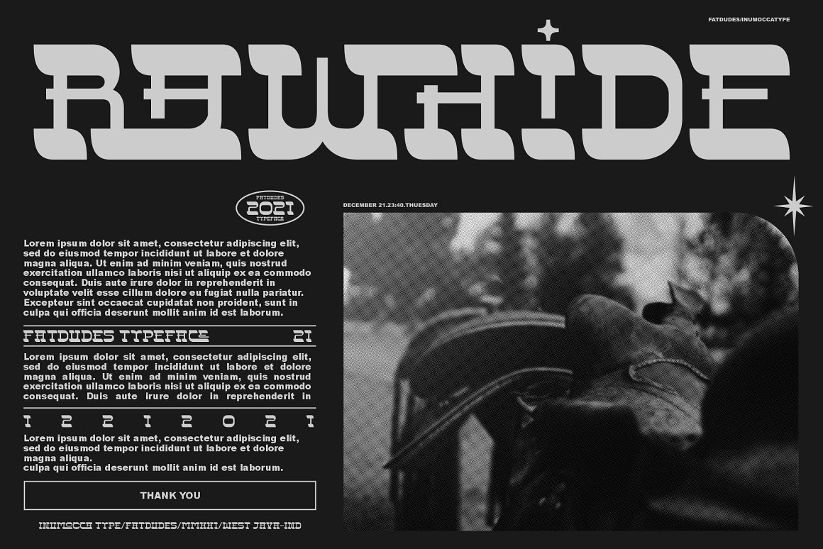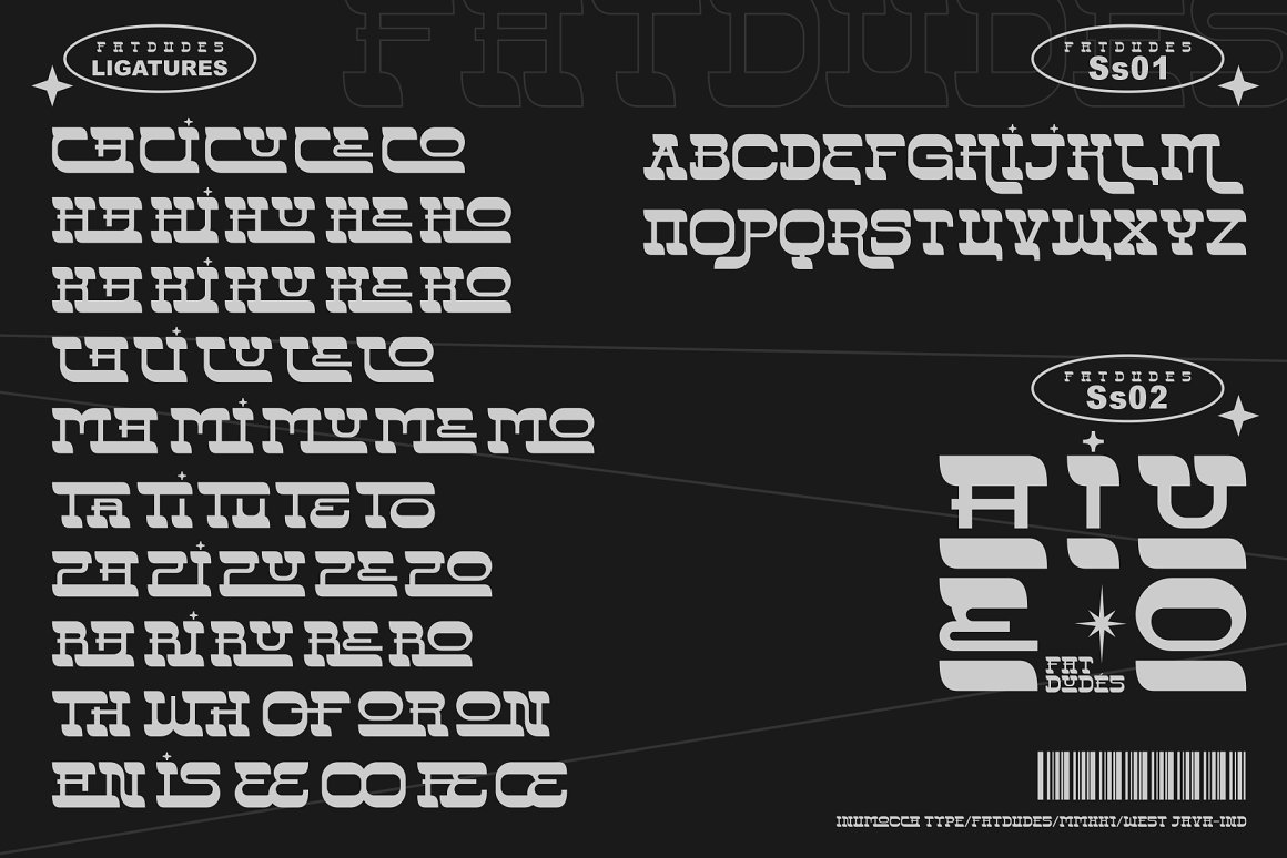 Fatdudes is A Reverse-Contrast letterform , western atmosphere. With Variant for the Capital Letters All Caps. and I want to Presenting the letterform Western style The Typeface comes with Stylistic Set and Ligature Combinations Exellent typeface to use for covering your Project, like Branding, Movie Title, Headline Letter, Bookcover or Book Content, Magazine cover, Poster, Quotes Lettering, Logos, and more your project design.